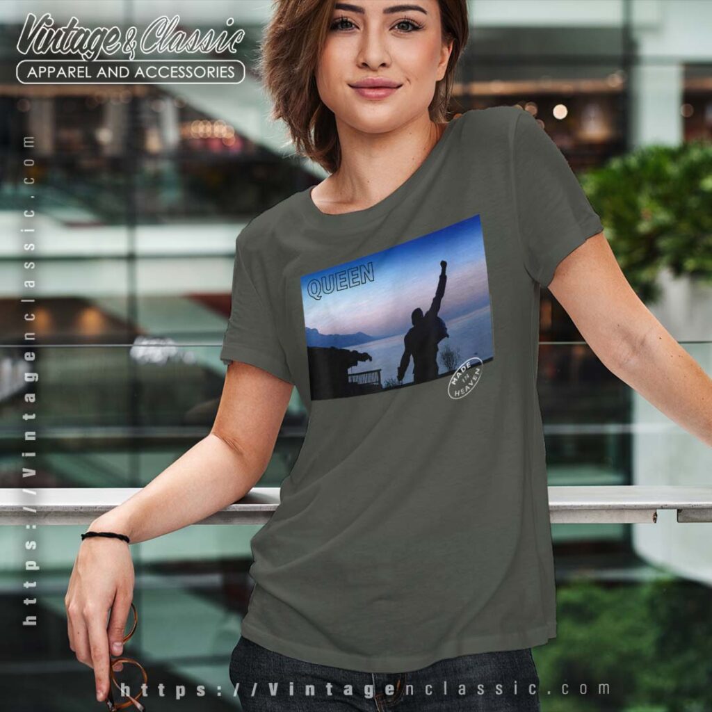 This is a vintage-style t-shirt featuring a design inspired by Queen’s iconic album “Made in Heaven.” The design is a tribute to the band’s legendary status and their enduring legacy. The shirt is likely to be a popular choice for Queen fans and music enthusiasts alike.