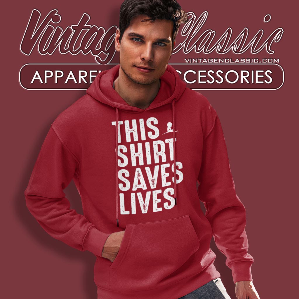 This design features the bold statement “THIS SHIRT SAVES LIVES” in large, distressed white lettering, creating a strong visual impact. A small silhouette logo at the top right subtly reinforces the message of compassion and charitable giving. This minimalist yet striking design makes it easy to pair with any outfit, ensuring you stand out while supporting a meaningful cause.