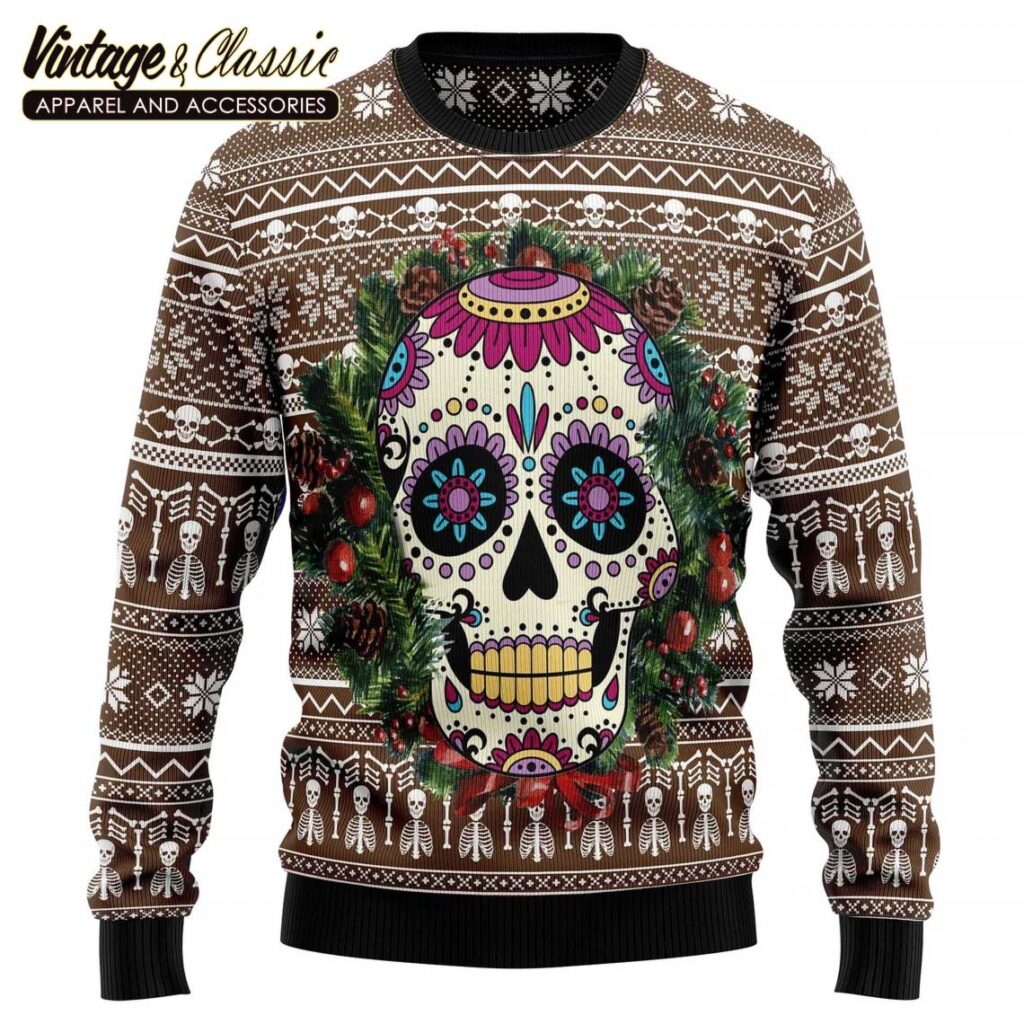 The design features a vibrant and eye-catching sugar skull motif, a symbol of Mexican culture and a popular holiday icon. The sweater is sure to be a hit with those who love a touch of the unique and quirky.