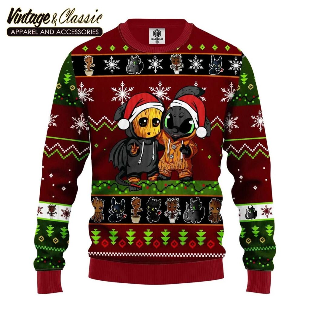 This is a festive and unique Christmas sweater featuring a beloved character from the “Guardians of the Galaxy” movie franchise, Baby Groot, and a magical unicorn. The design is sure to be a hit with fans of both characters. The “Baby Groot and Toothless Unicorn” design is a playful and whimsical take on the classic Ugly Christmas Sweater theme.