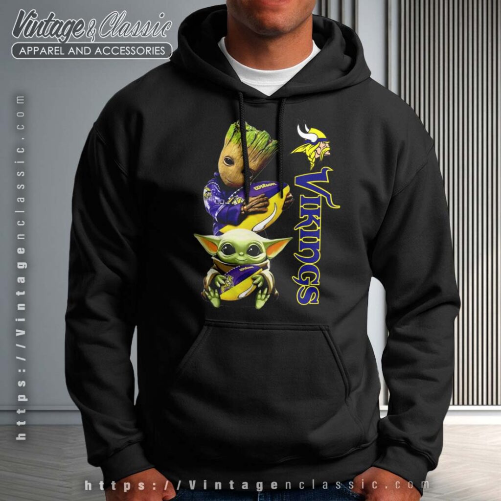 This adorable and unique t-shirt features a heartwarming image of Baby Groot and Yoda hugging, a playful nod to the beloved characters from the “Guardians of the Galaxy” and “Star Wars” franchises. The design is a perfect blend of pop culture nostalgia and Minnesota Vikings fandom, making it a unique and fun statement piece for any fan.