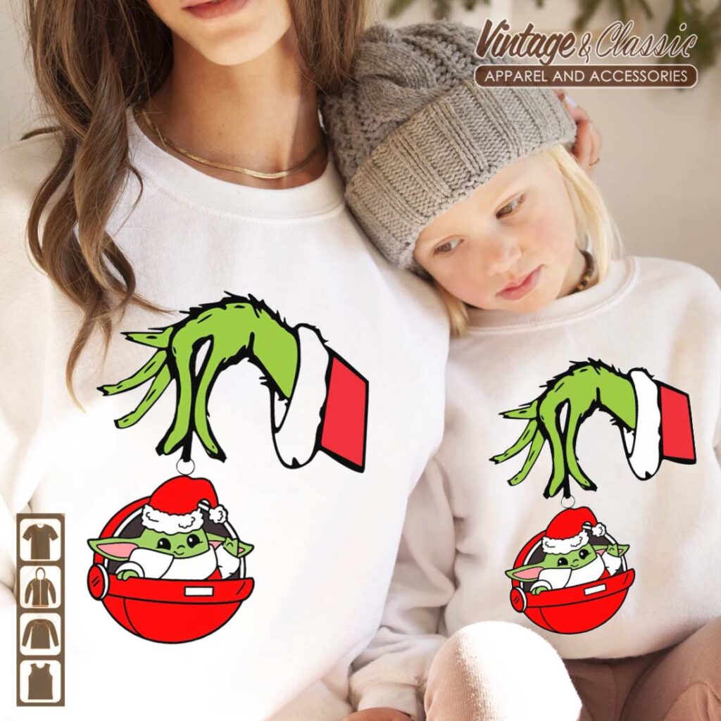 This festive tee is a delightful collision of two beloved holiday icons. The iconic Baby Yoda, with his adorable features and mischievous grin, is paired with the grumpy but ultimately good-hearted Grinch. The image combines the charm of the “Child of the Force” with the mischievous spirit of the Grinch, creating a unique and playful design.
