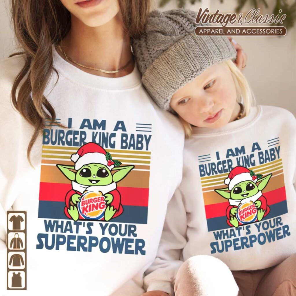 The shirt features an irresistibly cute Baby Yoda wearing a Santa hat, clutching a Burger King logo. The vibrant colors bring the design to life, making it both eye-catching and heartwarming. The text, “I’m A Burger King Baby What’s Your Superpower,” adds a humorous touch, blending pop culture with holiday cheer. It’s a delightful mix of whimsy and festive fun that’s perfect for the season.