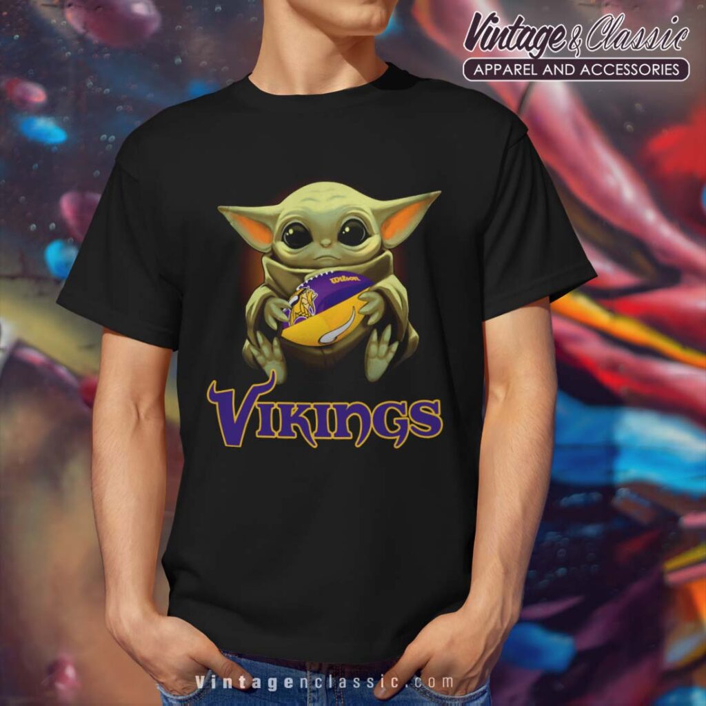 This is a fun and unique t-shirt design featuring Baby Yoda, the beloved character from “The Mandalorian,” hugging a Minnesota Vikings helmet. The image is sure to be a hit with fans of both Star Wars and the Minnesota Vikings.