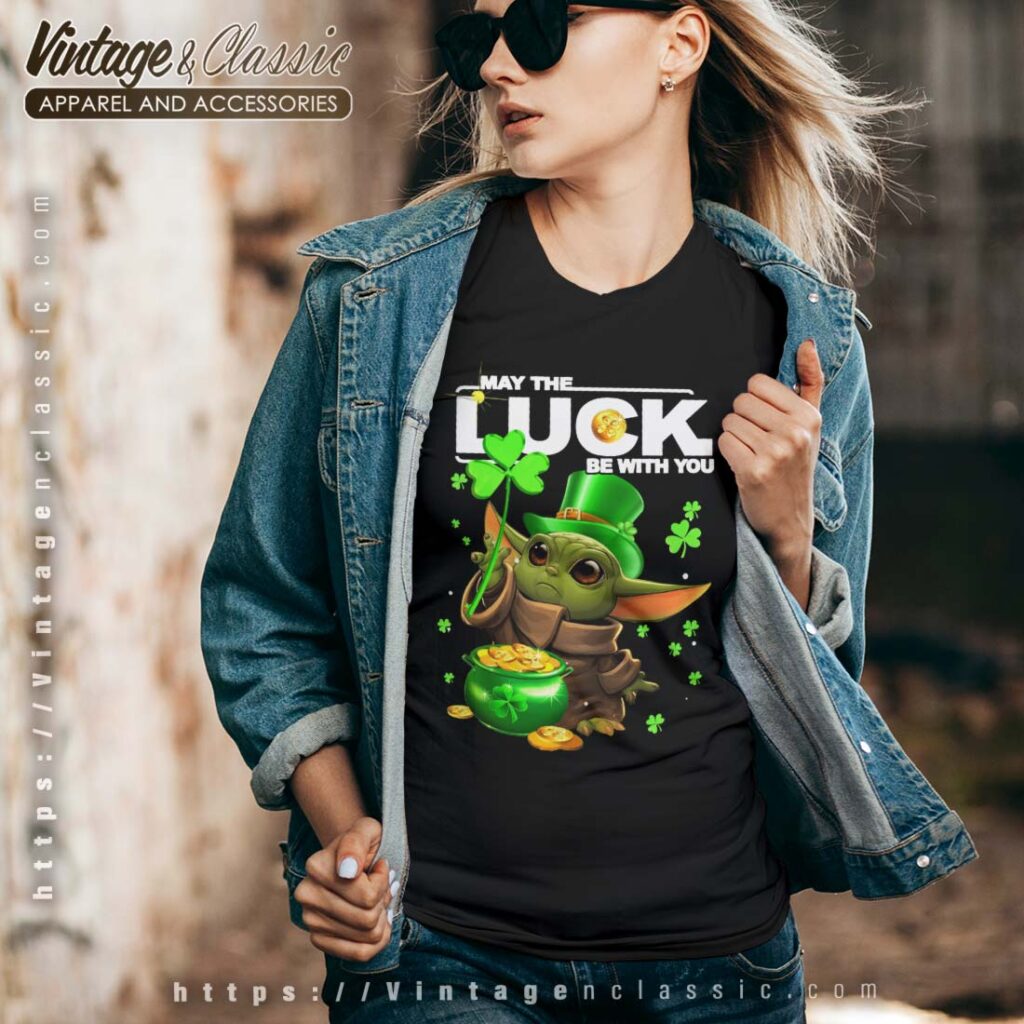 This shirt is a fun and festive way to celebrate St. Patrick’s Day! It features the beloved Baby Yoda character, known affectionately as “Baby Yoda” or “Grogu,” with the iconic “May the Luck Be With You” message. This design is perfect for anyone who loves Star Wars and the holiday.