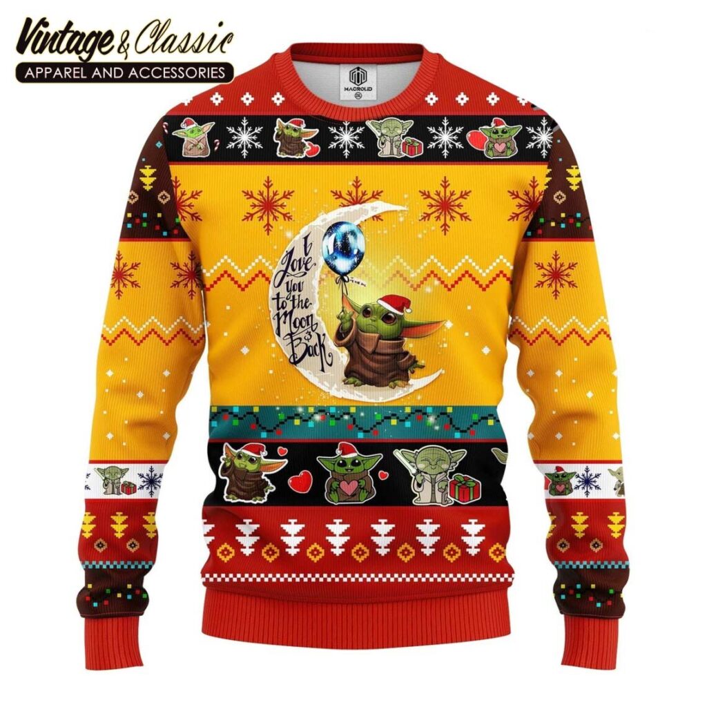 This is a festive and adorable sweater for any Star Wars fan! The “Baby Yoda Moon and Back” design is a playful take on the beloved character, Baby Yoda, with a cute and whimsical design. The “Ugly Christmas Sweater” aspect adds a touch of fun and humor to the holiday season.