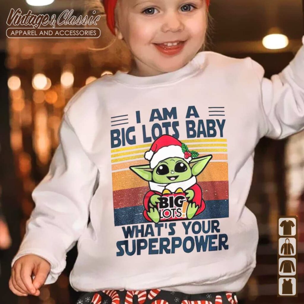 This is a fun and festive shirt for any Star Wars fan! It features Baby Yoda, aka Grogu, in his iconic Santa outfit. The “Big Lots” and “Baby What’s Your Superpower” elements add a playful touch to the classic Christmas spirit. This shirt is perfect for holiday gatherings, family photos, or just showing off your love for the adorable little Jedi.