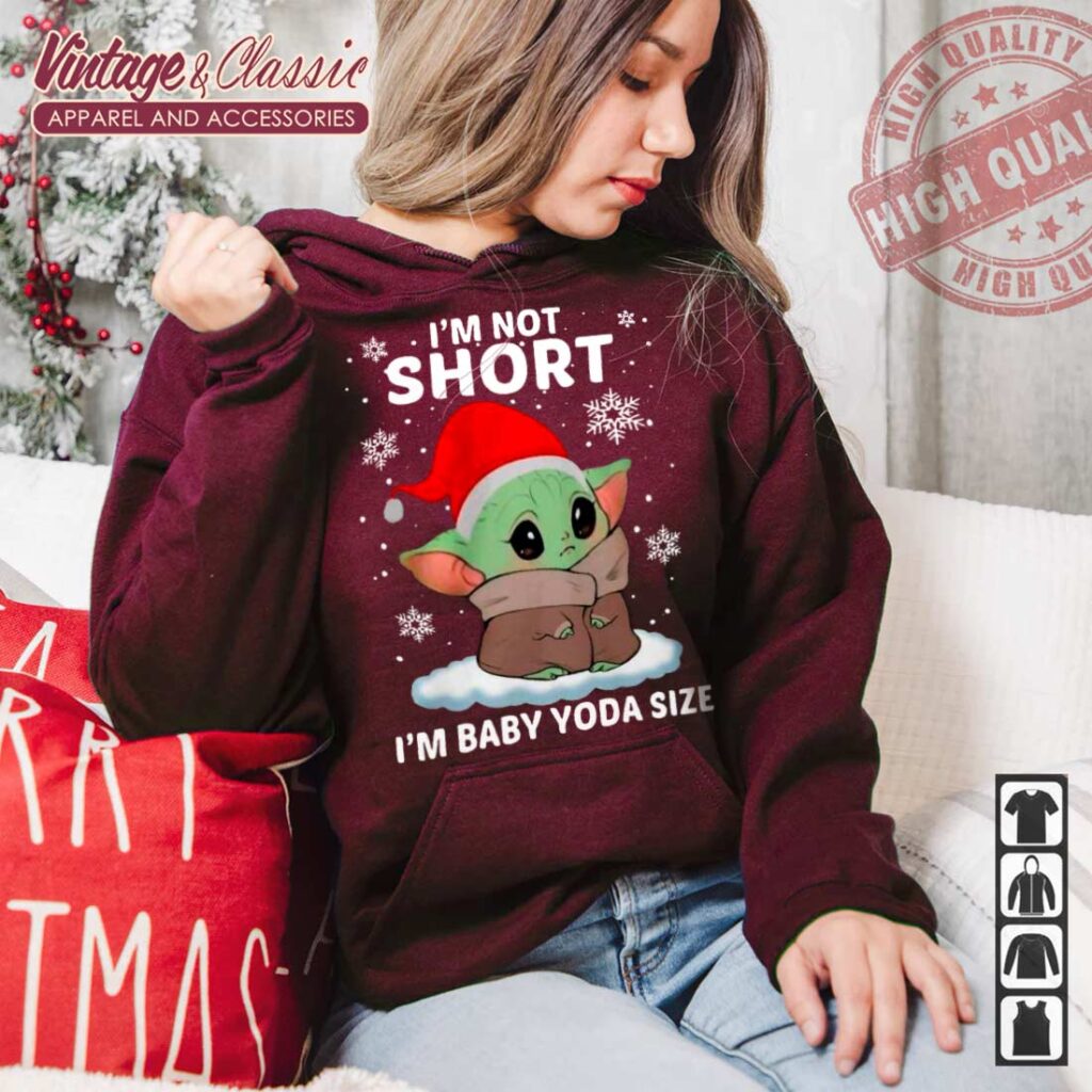 The printed graphic features Baby Yoda in a cute Santa hat, sitting snugly amidst snowy accents. The phrase “I’m Not Short, I’m Baby Yoda Size” adds a playful twist, making it a fun conversation starter. The combination of the iconic character and festive elements creates a heartwarming design that captures the joy of the season while celebrating one of pop culture’s favorite figures.