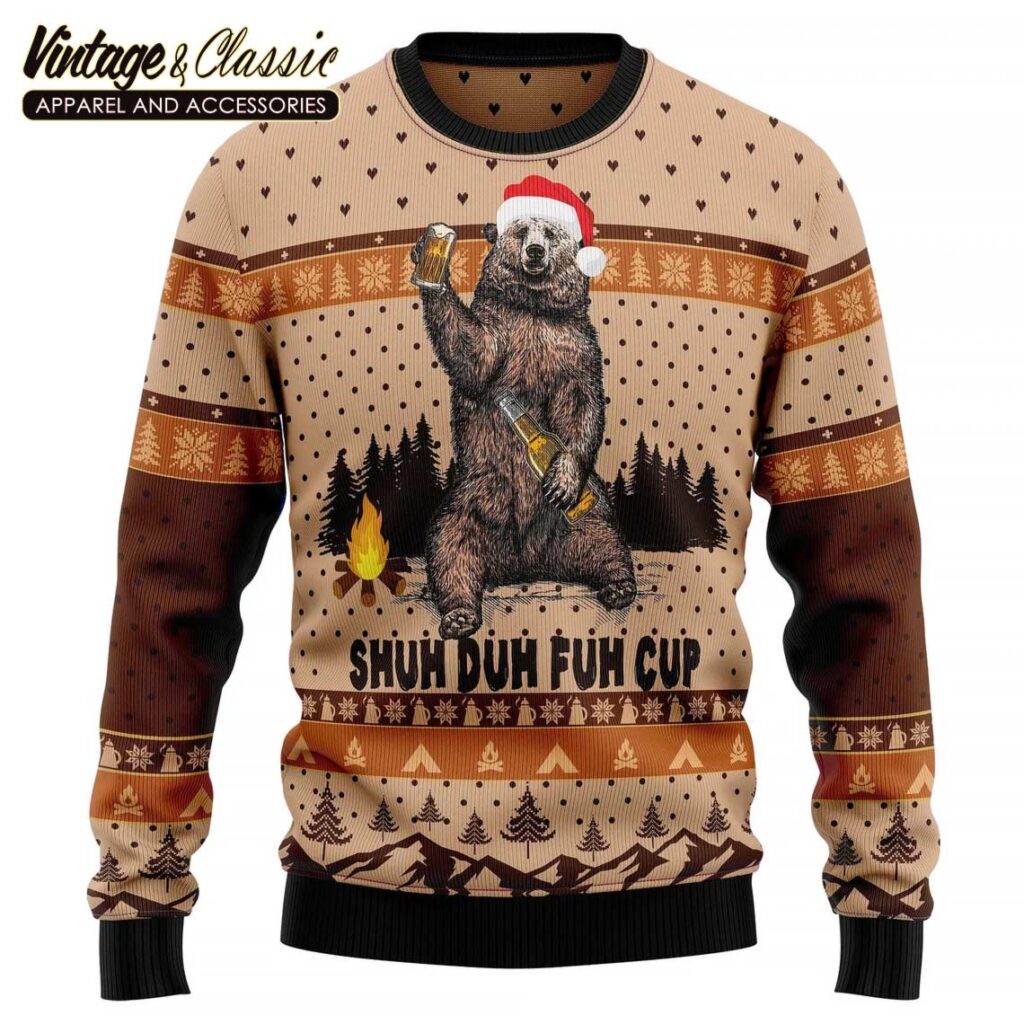 This is a fun and festive Christmas sweater! It features a playful design with a bear camping in a wintery scene. The “Shuh Duh Fuh” text adds a touch of humor and holiday cheer. This sweater is perfect for anyone who loves to embrace the quirky side of Christmas.