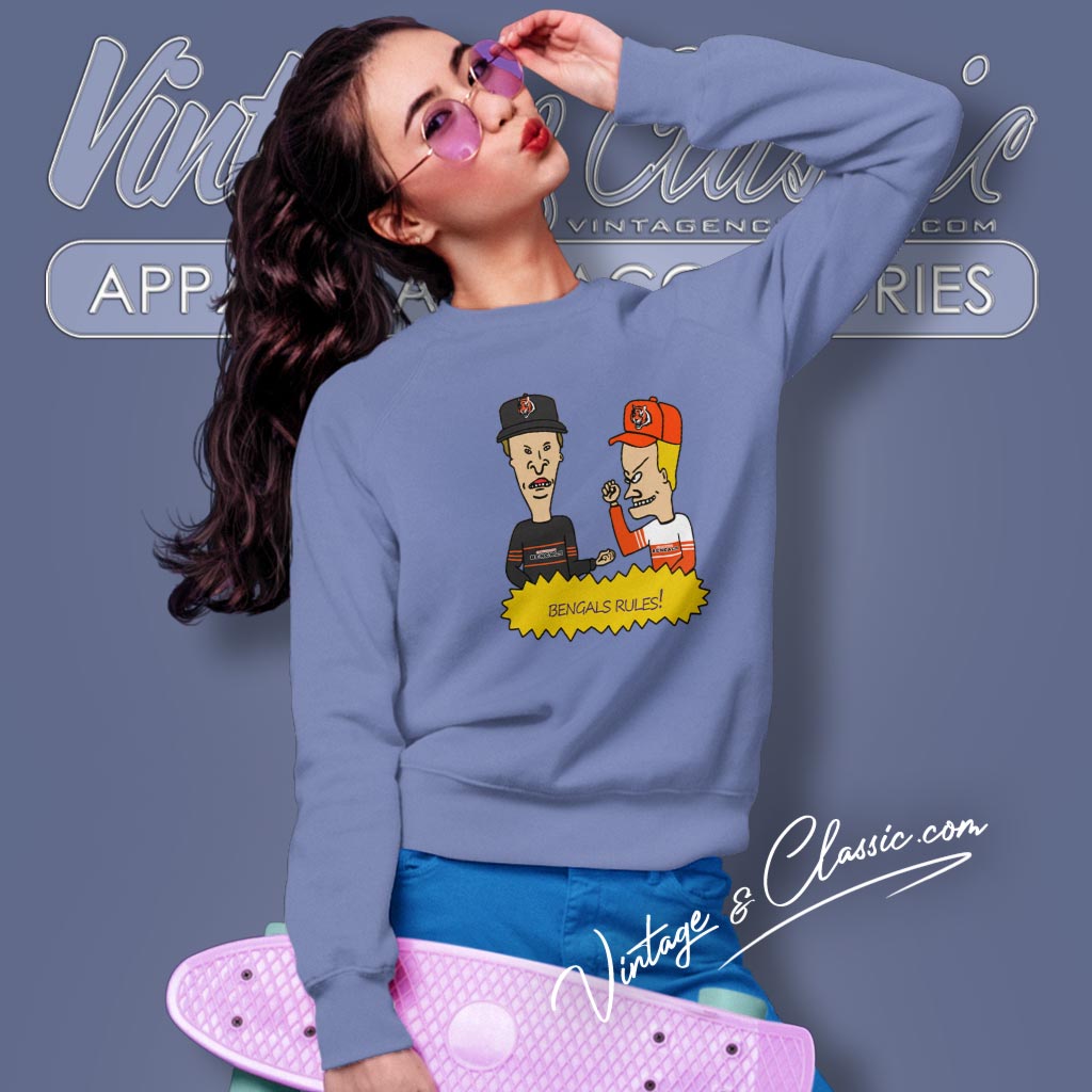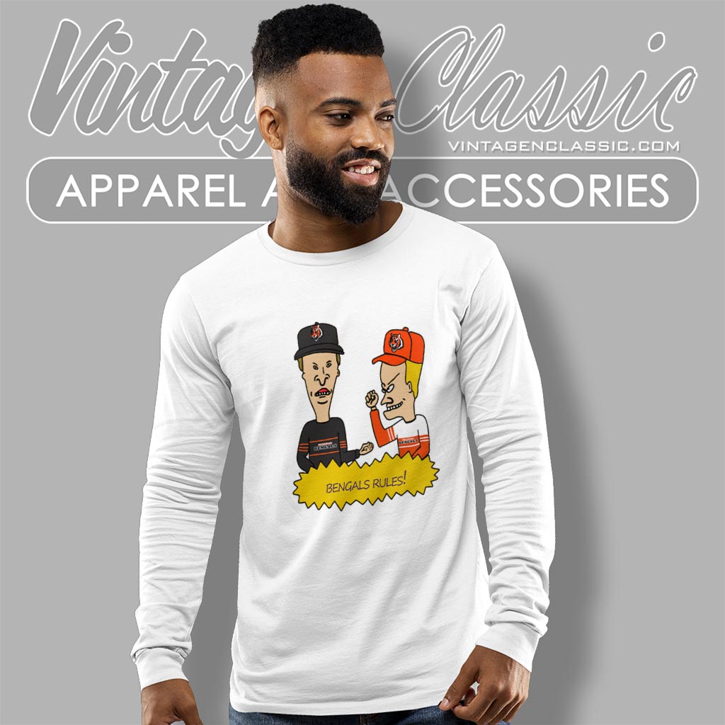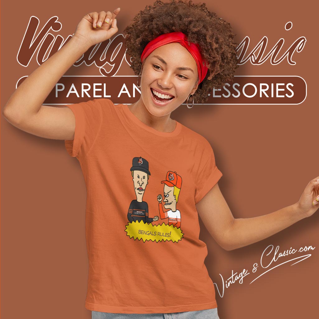 The design features Beavis and Butt-Head hyped up in Bengals gear, shouting out “Bengals Rules!” with their classic over-the-top expressions. The combination of bold orange, black, and white team colors with the cartoon’s vintage art style gives this shirt a fun, standout look. It perfectly channels the passionate, sometimes rowdy energy of Cincinnati football fans while nodding to ‘90s pop culture.
