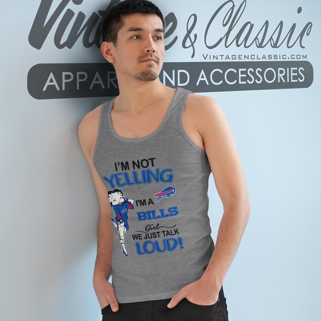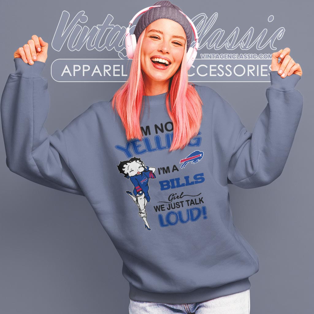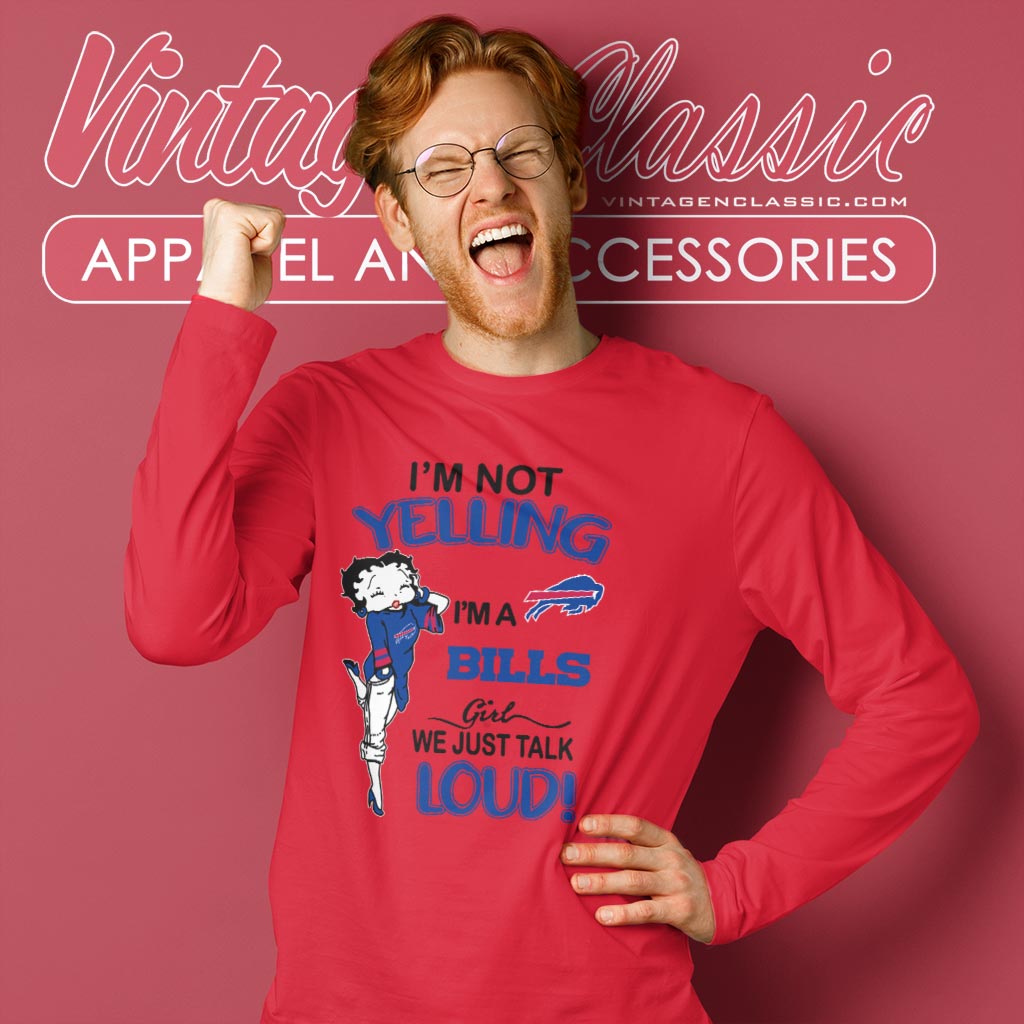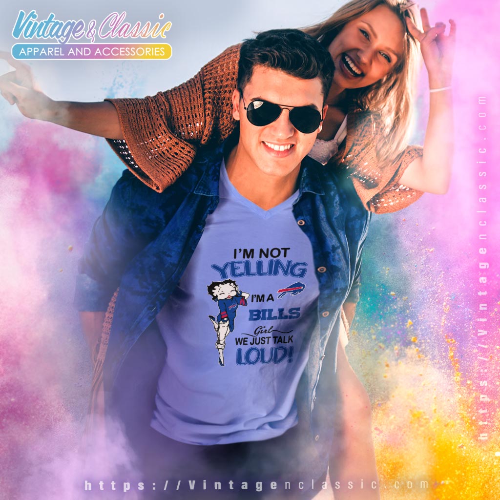This shirt features a delightful graphic of Betty Boop dressed in classic Bills colors, holding a football, and striking a confident pose. The playful text, “I’m Not Yelling, I’m A Bills Girl, We Just Talk Loud!” captures the vibrant energy and enthusiasm of Bills fans everywhere. The artwork cleverly combines the timeless appeal of Betty Boop with the unmistakable symbols of the Bills, including their iconic logo and color scheme, creating a captivating design that stands out in any crowd.