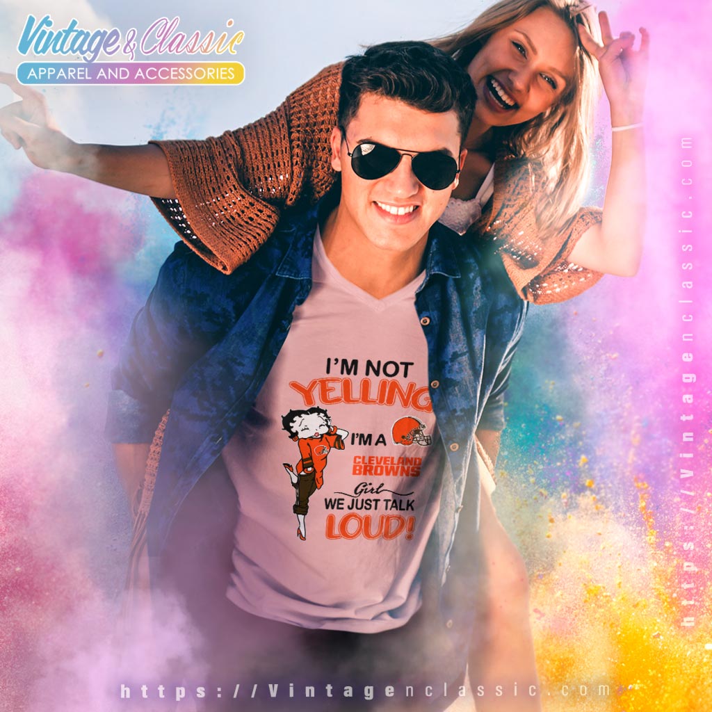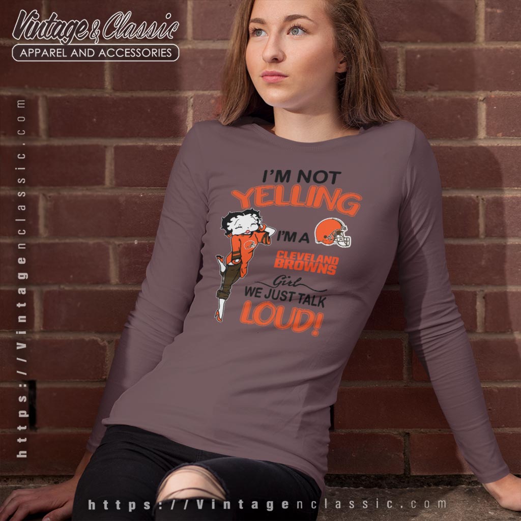 The shirt features the iconic Betty Boop in a spirited pose, dressed in Cleveland Browns colors. The bold orange and brown hues are instantly recognizable and connect directly to the team’s traditional palette. Betty’s confident stance and the accompanying Browns helmet logo emphasize the energy and enthusiasm unique to Browns supporters. The playful text, “I’m Not Yelling, I’m a Cleveland Browns Girl We Just Talk Loud,” adds a humorous twist, perfectly blending the classic charm of Betty Boop with the dynamic spirit of the Browns.