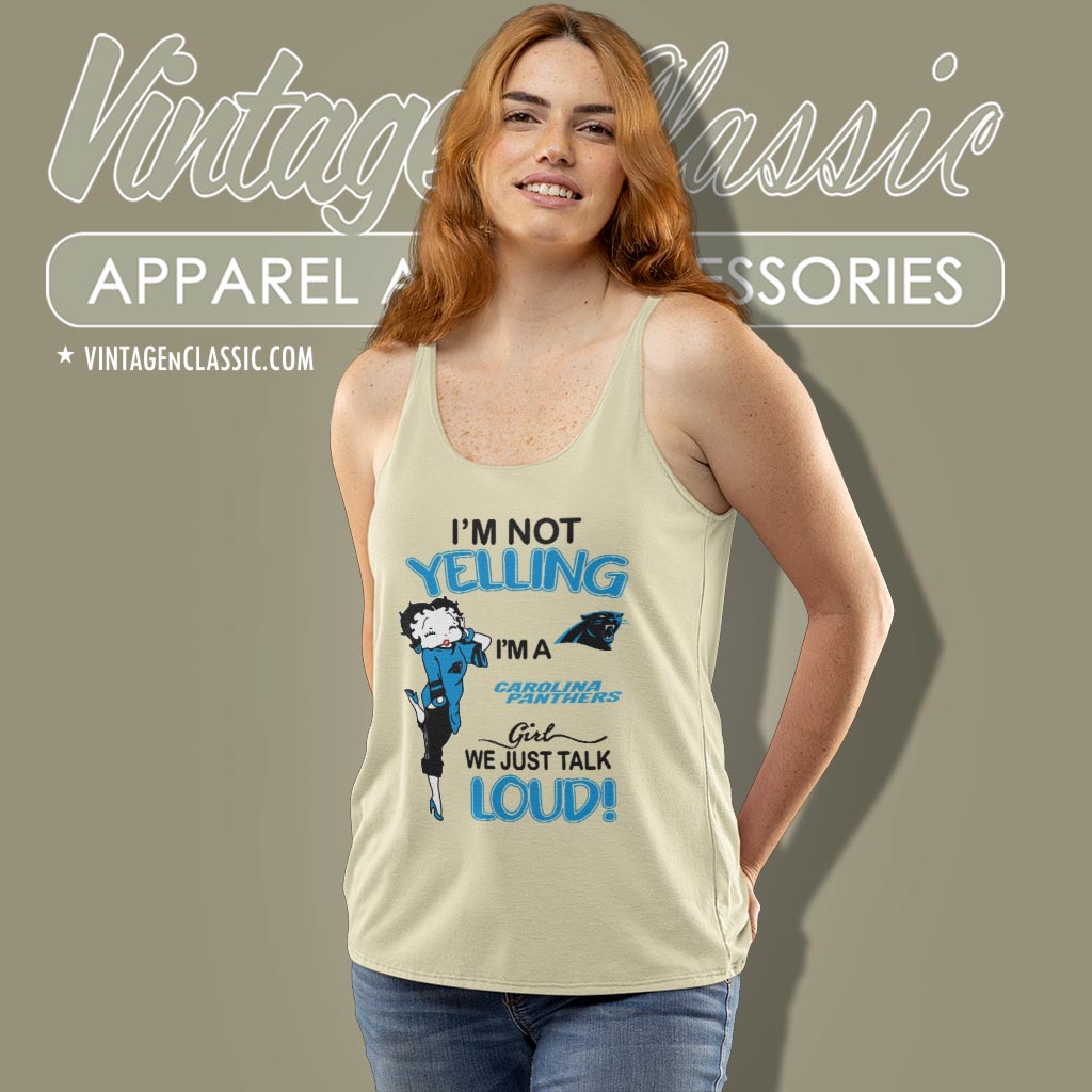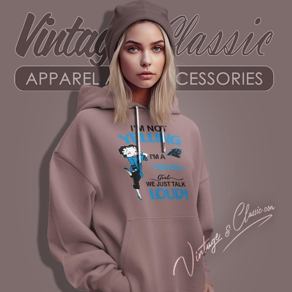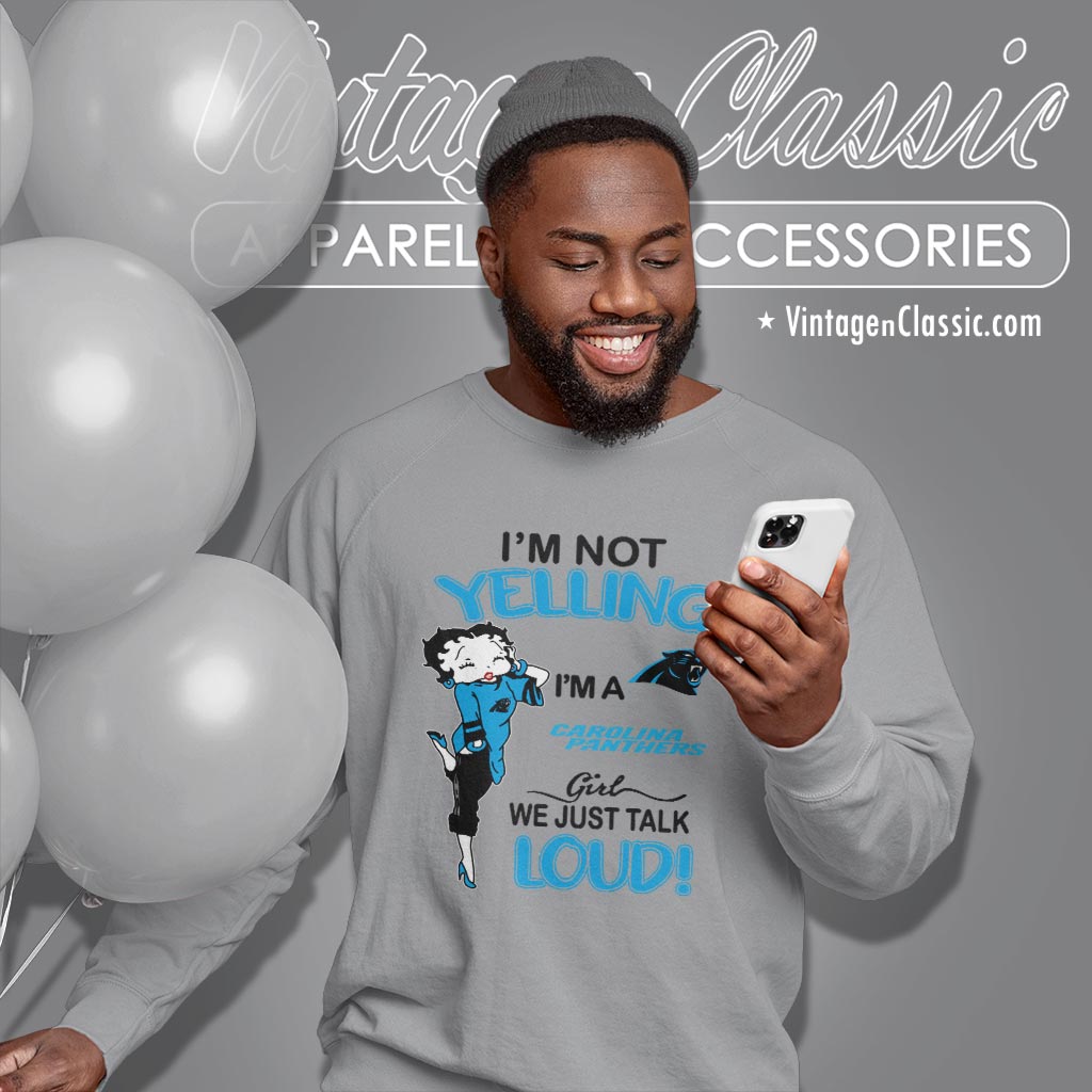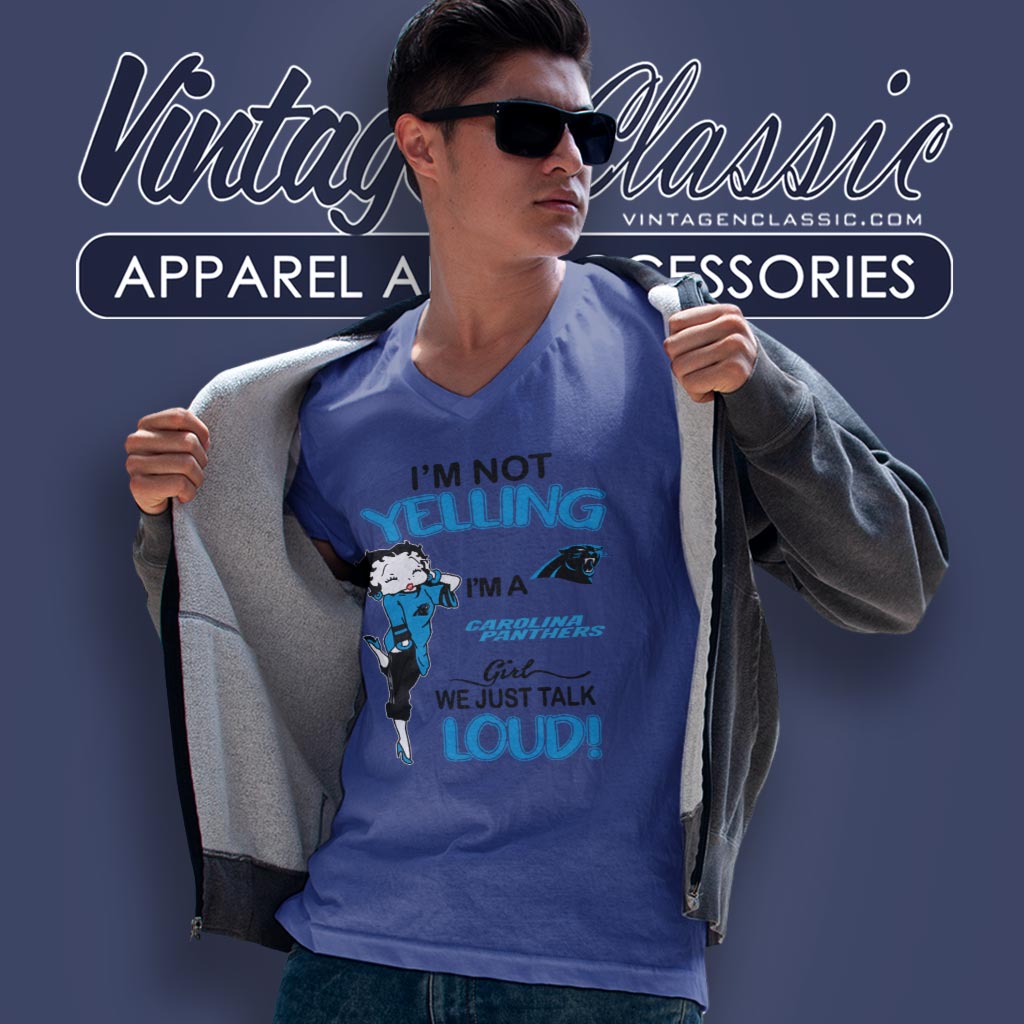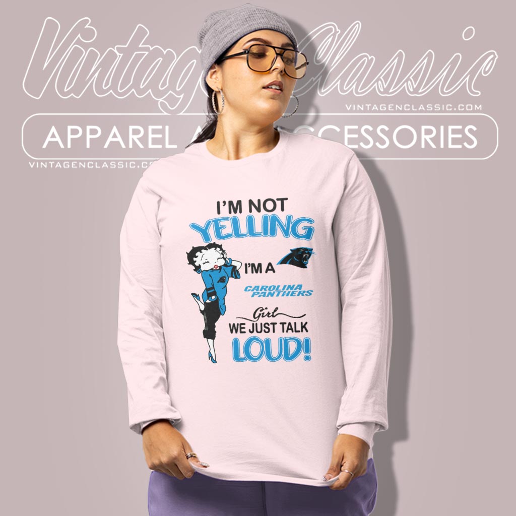 The graphic design on this shirt is a fun and bold tribute to Panthers fans. Betty Boop is depicted in the team’s traditional blue and black colors, exuding confidence and flair. Her lively pose and the playful text, “I’m Not Yelling, I’m A Panthers Girl, We Just Talk Loud!” capture the true essence of passionate fandom. The integration of the Panthers logo adds an authentic touch, making this shirt a perfect blend of pop culture and sports loyalty.