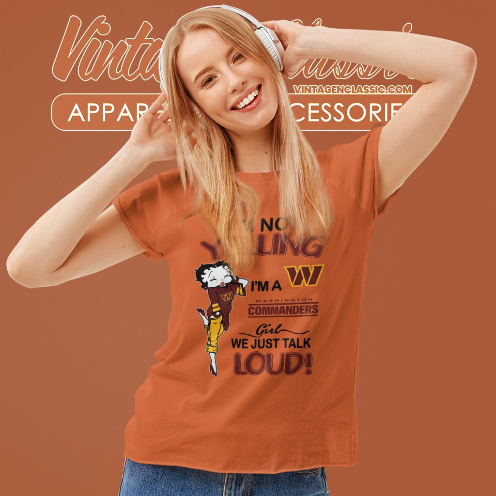 Express your loyalty with the Betty Boop I’m Not Yelling I’m A Commanders Girl We Just Talk Loud Shirt. This tee is perfect for fans who love to showcase their passion for the Washington Commanders. Featuring bold colors and a fun design, it captures the spirit of the team and stands out in any crowd. Let everyone know you’re a proud Commanders supporter with this eye-catching shirt.