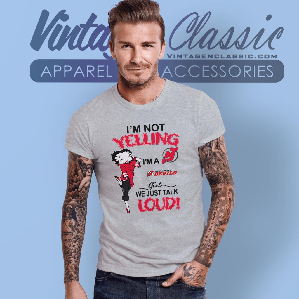 The eye-catching design features Betty Boop in her sassy pose, dressed in the unmistakable team colors of red and black, perfectly mirroring the New Jersey Devils’ fierce spirit. The shirt’s playful text, “I’m Not Yelling, I’m a Devils Girl, We Just Talk Loud!” captures the essence of passionate fans who live and breathe their team’s victories and challenges. The inclusion of the Devils’ logo adds an official touch, making it an ideal wear for game day or any casual outing where you want to show off your team pride.
