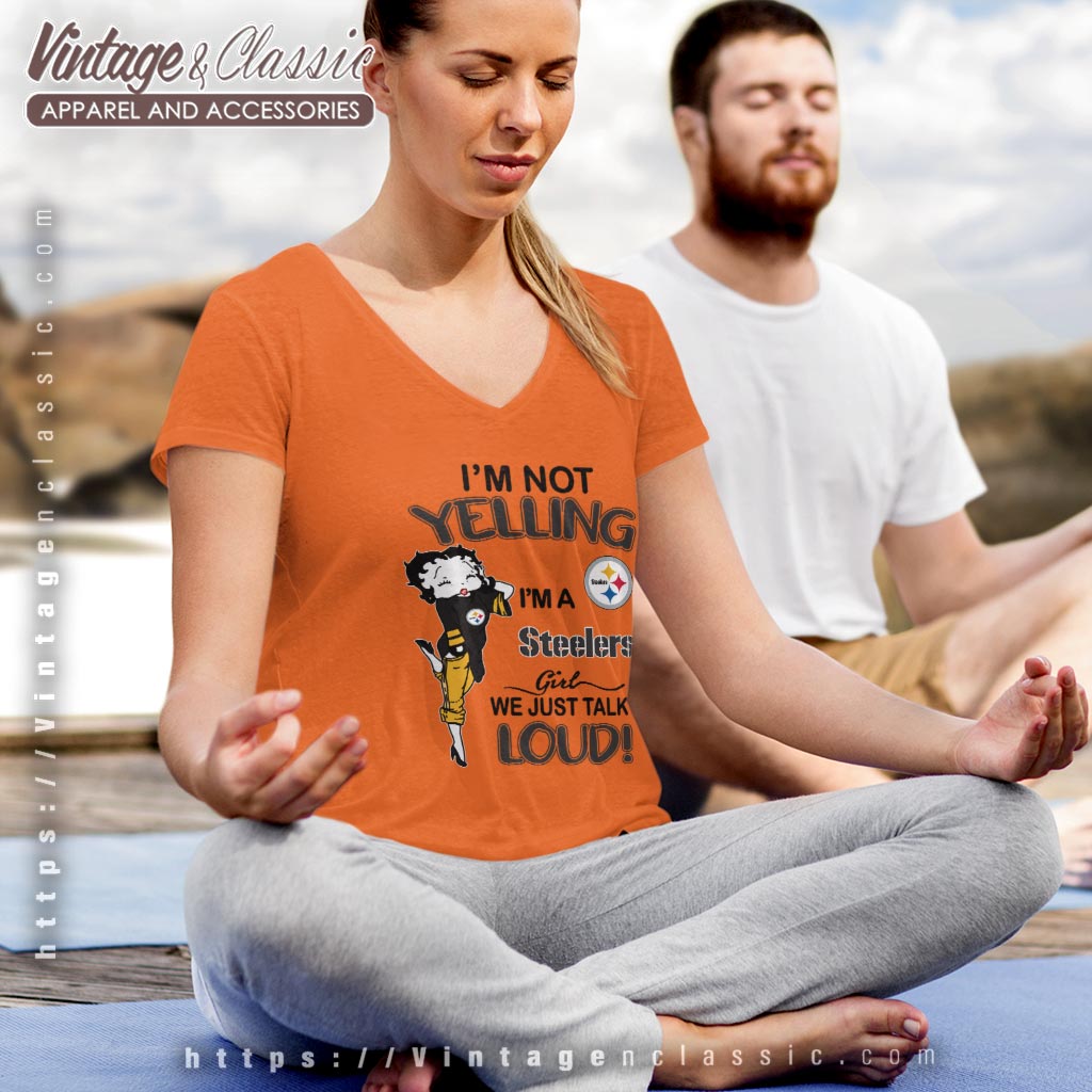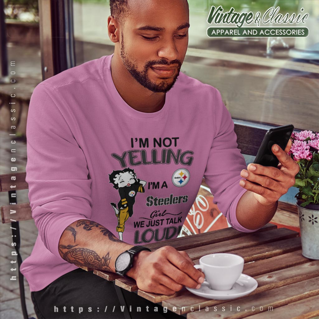 This shirt features the beloved Betty Boop, styled in classic Steelers colors of black and gold. The design cleverly combines her iconic look with the team’s emblem, creating a unique fusion of pop culture and sports enthusiasm. The phrase “I’m Not Yelling, I’m A Steelers Girl, We Just Talk Loud!” adds a humorous twist that resonates with passionate fans. Whether it’s game day or any day, this shirt captures the essence of being a true Steelers supporter.