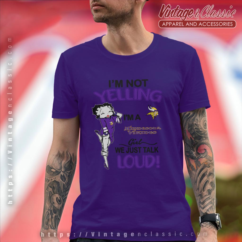 The Betty Boop I’m Not Yelling I’m A Vikings Girl We Just Talk Loud Shirt is an ideal gift for die-hard Vikings fans. Whether you’re wearing it to a game, a gathering with friends, or just around town, it’s a fun way to showcase your team spirit. Surprise a fellow fan or treat yourself to this unique piece of Vikings apparel.