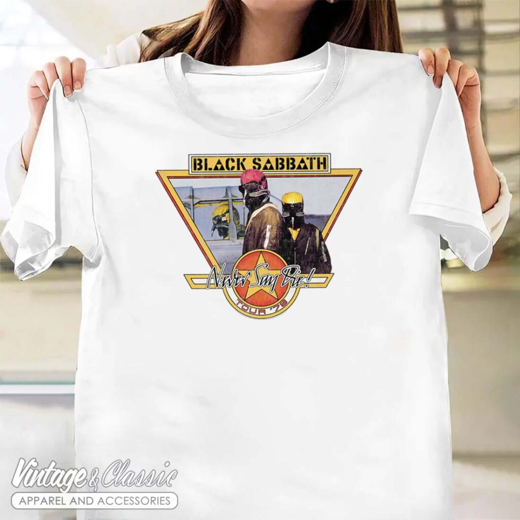 The “Black Sabbath Never Say Die” shirt is a tribute to the legendary heavy metal band, Black Sabbath. This iconic band, known for their dark and powerful sound, has left an indelible mark on the music world. The shirt features a graphic design that celebrates their legacy and their enduring influence.