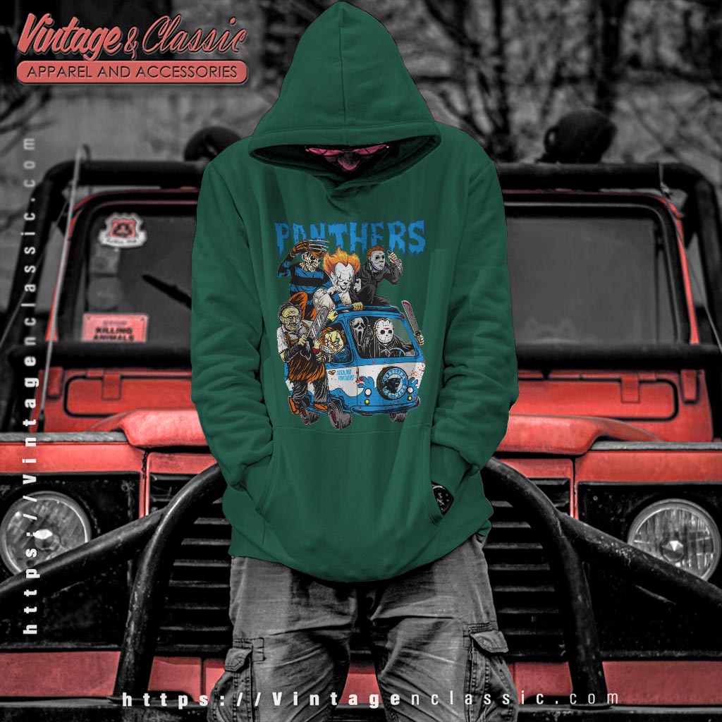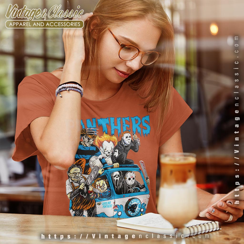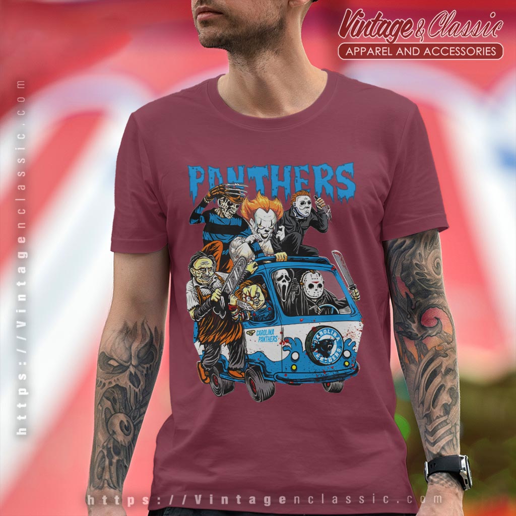 related keywords: Carolina Panthers horror characters Halloween shirt, Panthers Pennywise Freddy Jason tee, horror villains Carolina Panthers fan shirt, Halloween Panthers slasher van design