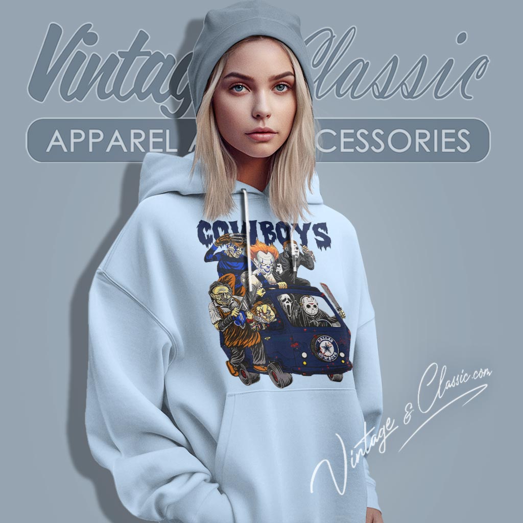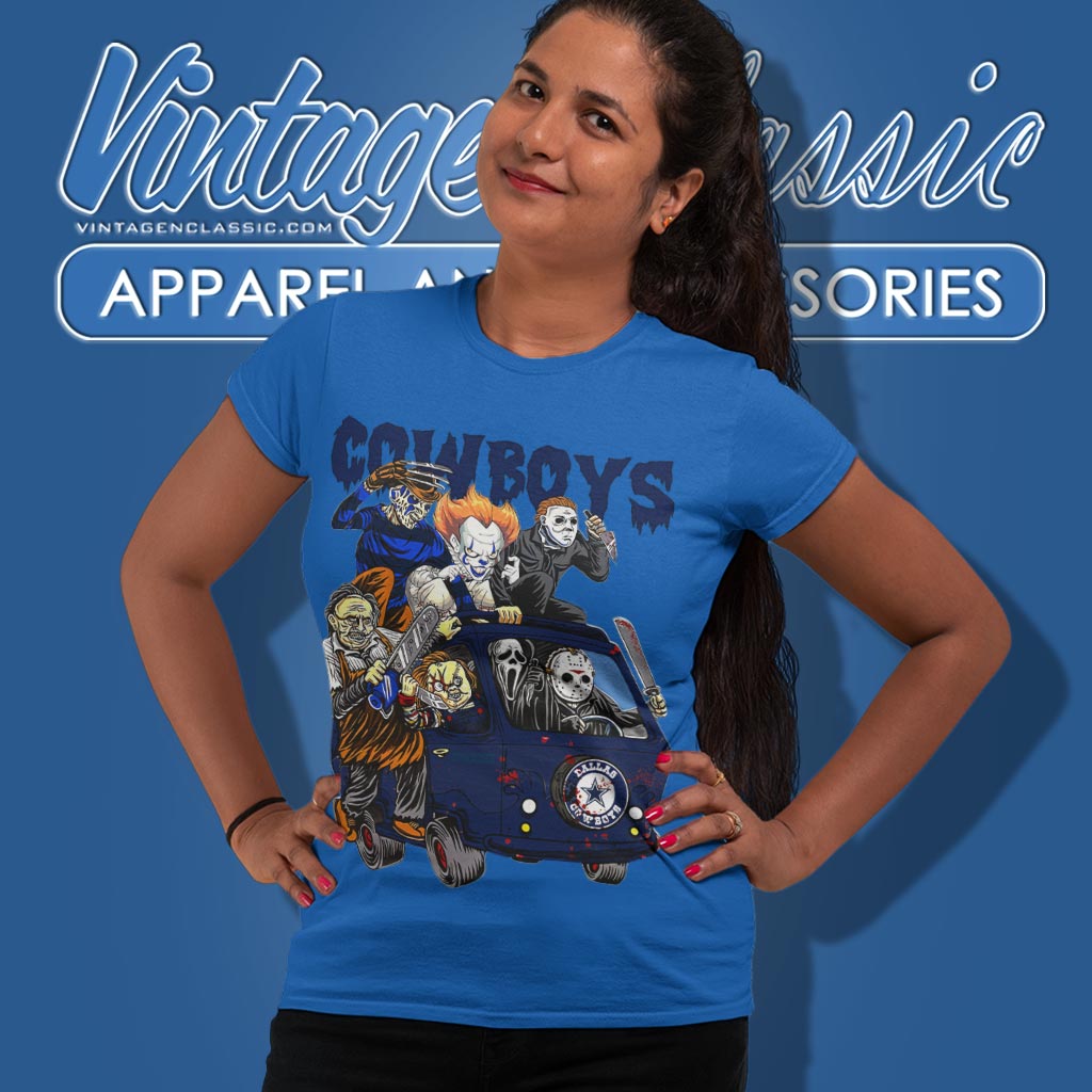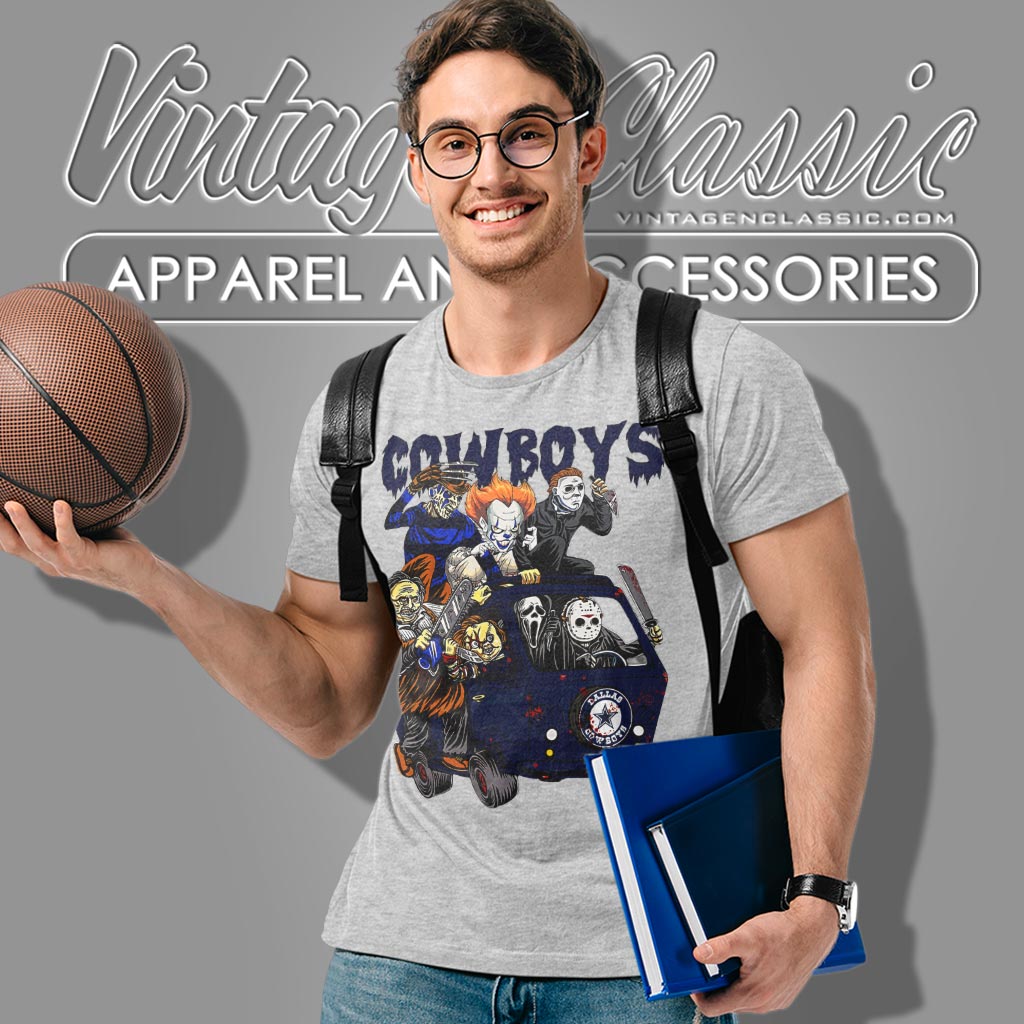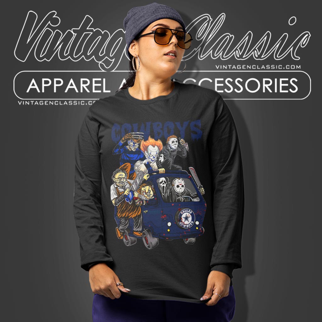 related keywords: Dallas Cowboys horror characters Halloween shirt, Cowboys Pennywise Freddy Jason tee, horror villains Dallas Cowboys fan shirt, Halloween Cowboys slasher van design