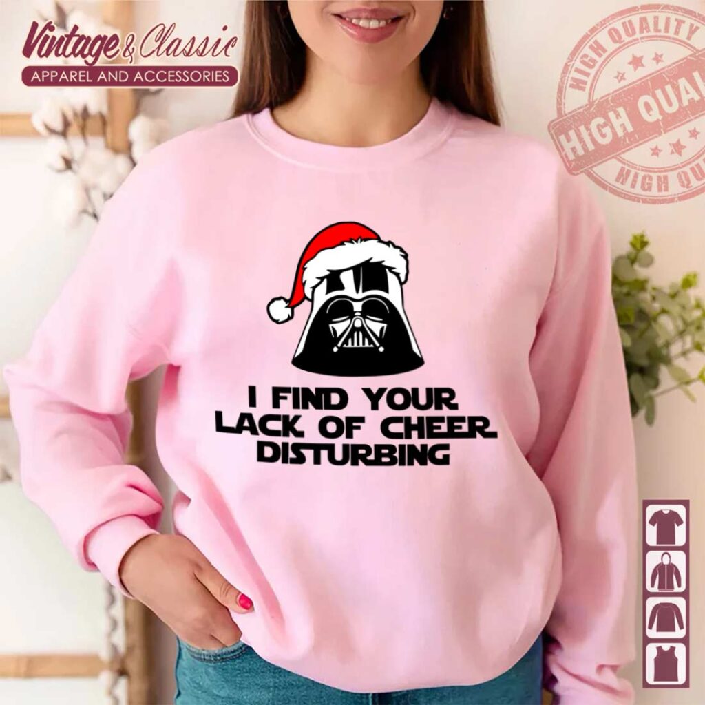 The centerpiece of this design is a brilliantly stylized Darth Vader helmet, instantly recognizable to any Star Wars enthusiast. But there’s a festive twist! Perched jauntily atop the dark lord’s iconic headgear is a classic red and white Santa hat, complete with a fluffy white pom-pom. This unexpected combination creates a humorous and charming visual that perfectly encapsulates the holiday spirit with a touch of the dark side. Below this fantastic graphic, the memorable quote “I FIND YOUR LACK OF CHEER DISTURBING” is displayed in bold, impactful lettering. This playful twist on Vader’s famous line is sure to get a laugh and perfectly captures the essence of a grinchy yet lovable holiday sentiment. It’s a design that marries the epic scope of Star Wars with the lighthearted fun of Christmas, making it truly stand out.