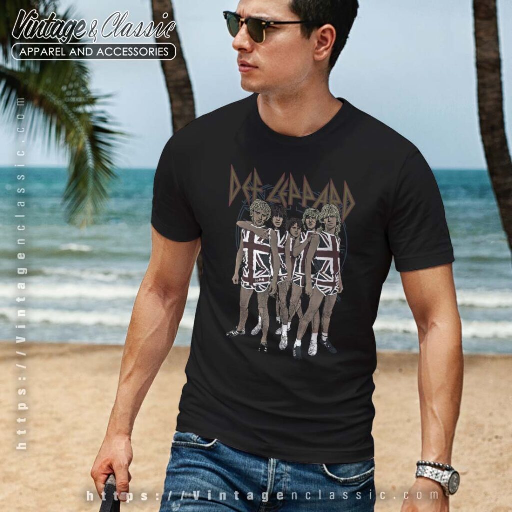 Related Keywords: Def Leppard Union Jack shirt; British rock band tee; iconic rock apparel; 80s rock music shirt
