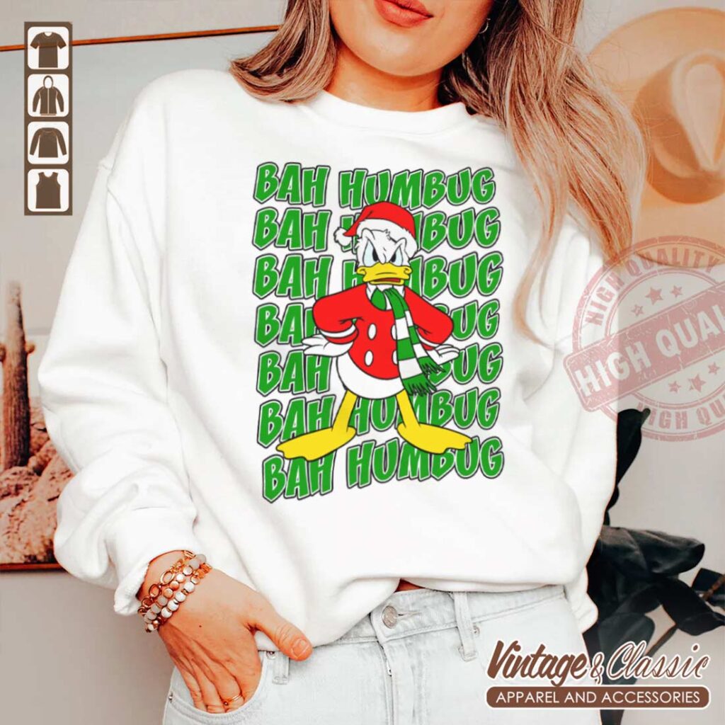 This is a festive and fun shirt for any Donald Duck fan! The design features the iconic character himself, Donald Duck, sporting his signature grumpy expression and the phrase “Bah Humbug” in a Christmas-themed design. This shirt is perfect for spreading holiday cheer and showing off your love for the beloved Disney character.