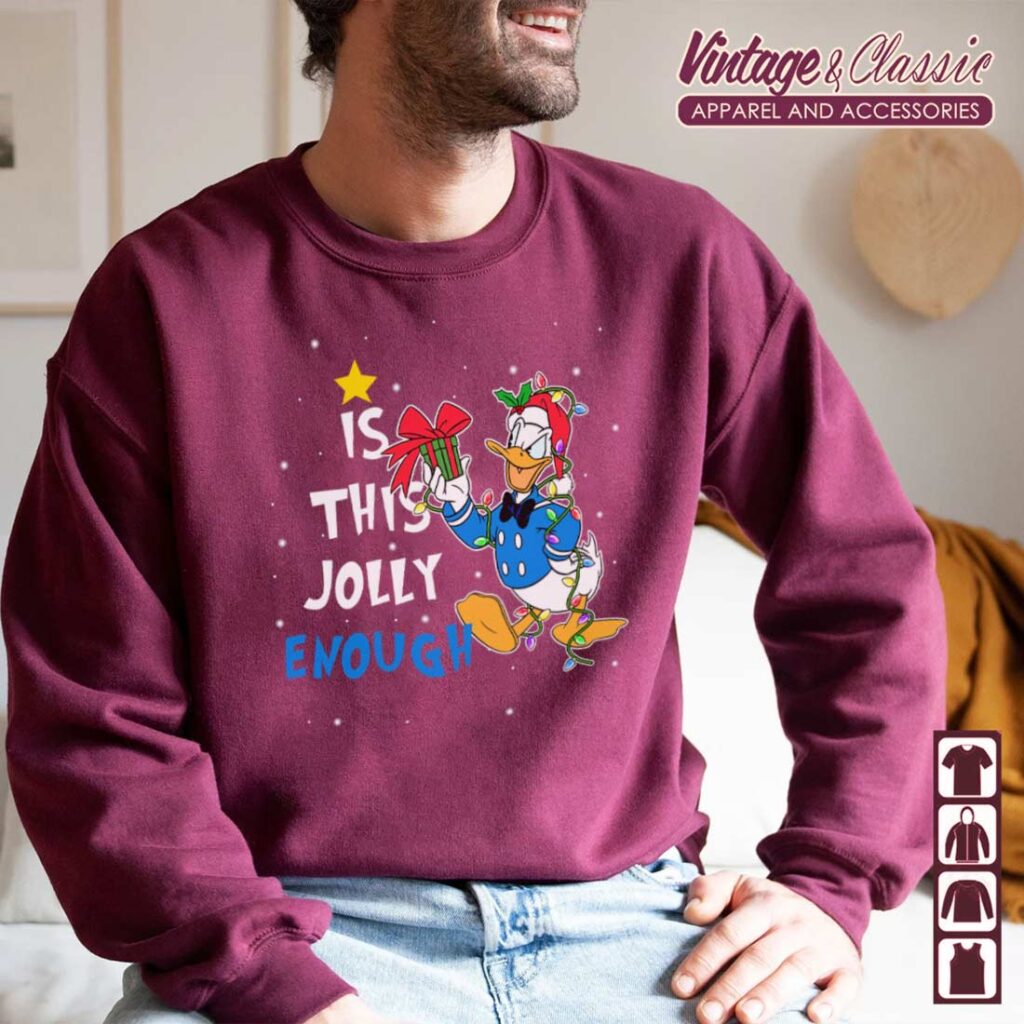 This Donald Duck Christmas Lights Shirt is a fun and festive way to celebrate the holiday season! The design features Donald Duck decked out in his iconic red and yellow colors, with a playful twist of Christmas lights adorning his outfit. The phrase “Is This Jolly Enough?” adds a touch of humor and personality to the design.