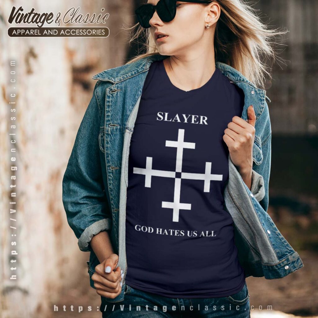 The “God Hates Us All Cross” Slayer shirt is a statement piece for fans of the heavy metal band Slayer. It’s a bold and provocative design that reflects the band’s dark and aggressive musical style. The shirt features a prominent cross, a symbol often associated with Christianity and death, juxtaposed with the band’s iconic “Slayer” logo. This combination creates a powerful visual that speaks to the band’s rebellious spirit and their exploration of themes of death and the struggle against societal norms.