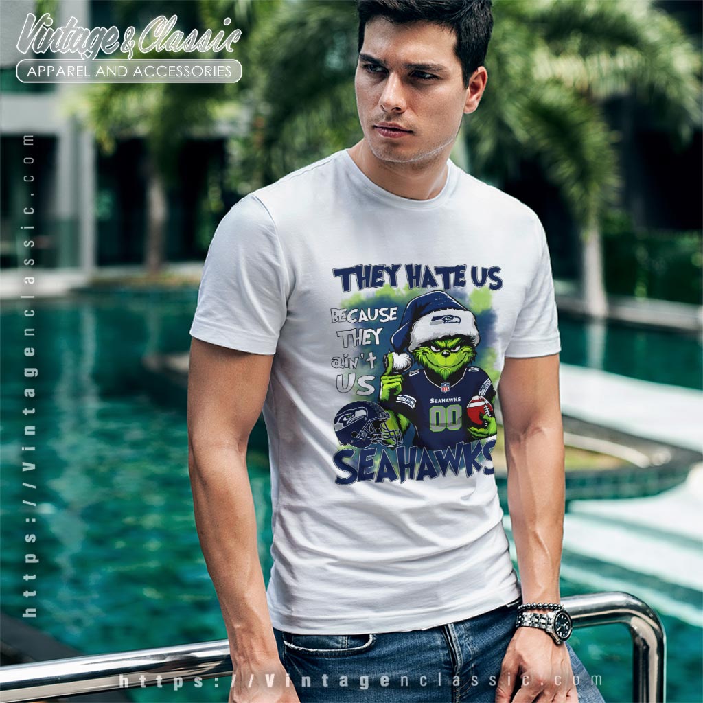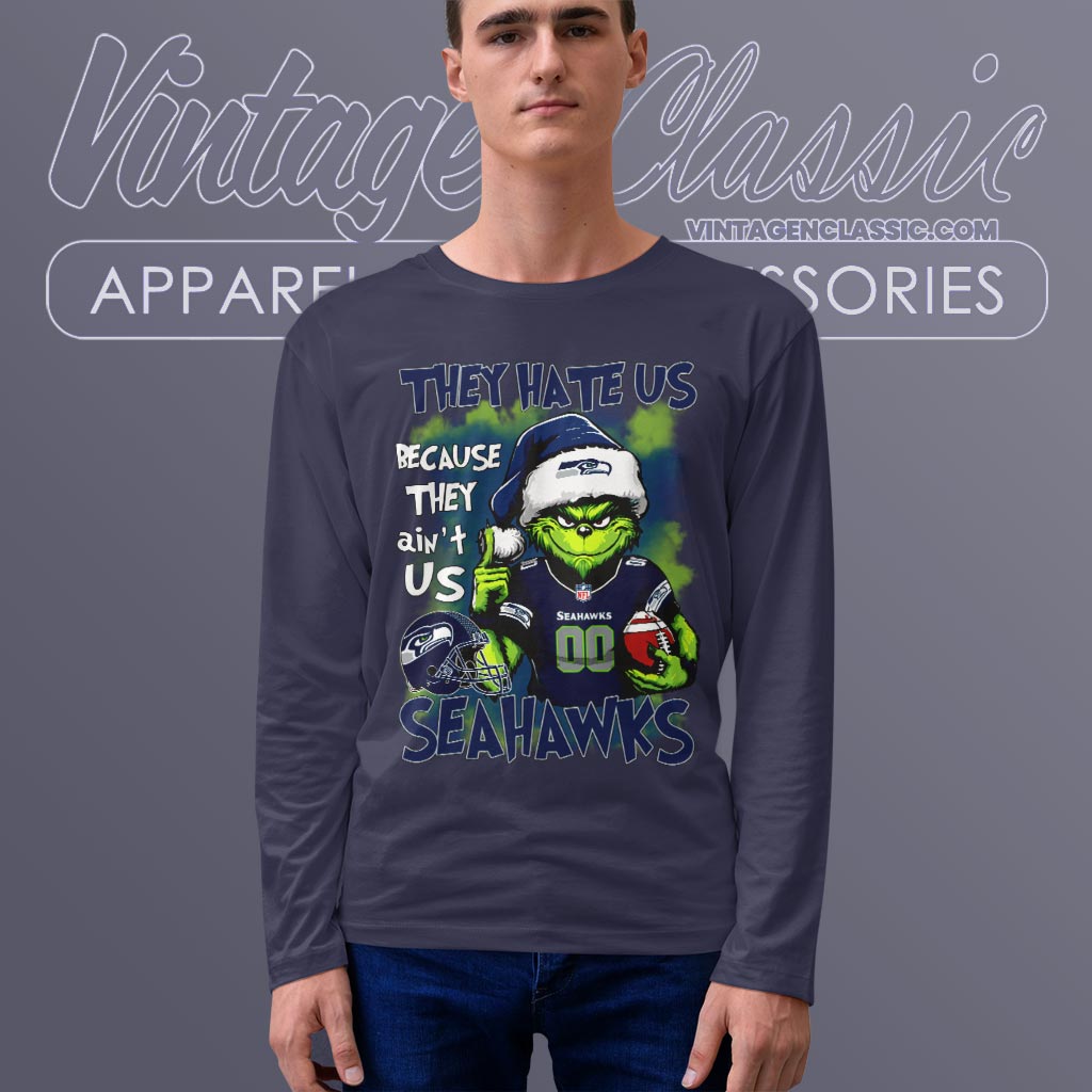 The shirt’s design features a mischievous Grinch donned in Seattle Seahawks gear, complete with the iconic team logo and colors. The phrase “They Hate Us Because They Ain’t Us” boldly declares your unwavering support and playful rivalry spirit. The artwork cleverly blends the Grinch’s classic green hue with the Seahawks’ blue and green, creating a design that’s both eye-catching and meaningful. Whether you’re at a holiday game or a festive gathering, this shirt is sure to spark conversations.
