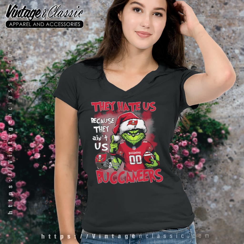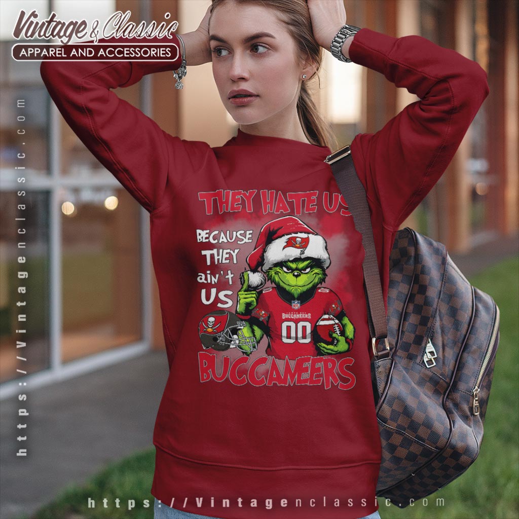 The shirt features the Grinch decked out in Buccaneers gear, complete with a Santa hat and jersey, perfectly embodying both holiday spirit and team pride. The phrase “They Hate Us Because They Ain’t Us” is boldly displayed, capturing the essence of camaraderie and rivalry. The Buccaneers’ traditional colors and logo are proudly showcased, making this shirt a must-have for any fan looking to stand out during the festive season. It’s a unique blend of humor and devotion to the Buccaneers.