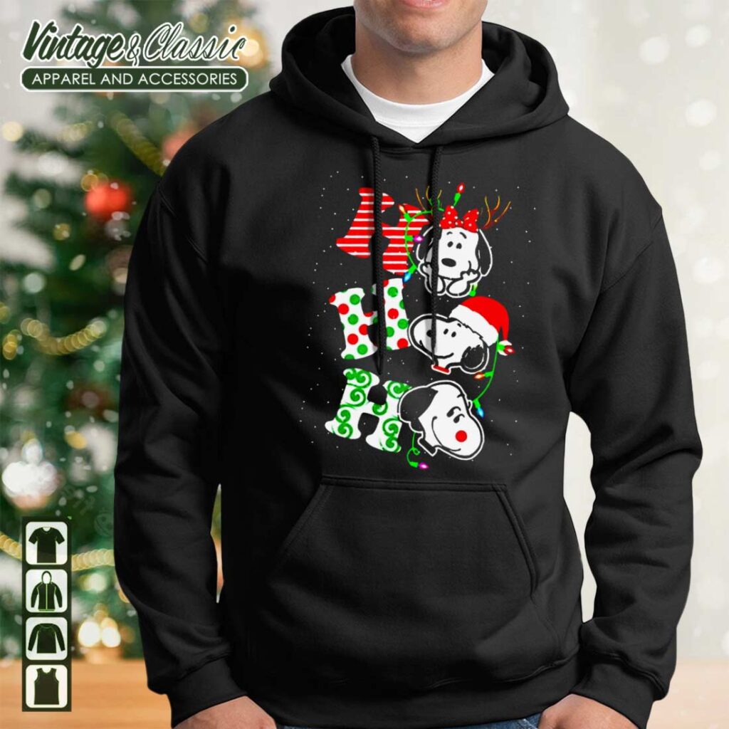 This is a festive and fun shirt featuring the beloved Peanuts character, Snoopy, decked out in his holiday spirit! The design is a playful take on the classic “Ho Ho Ho” with Snoopy’s iconic red nose and a festive touch.