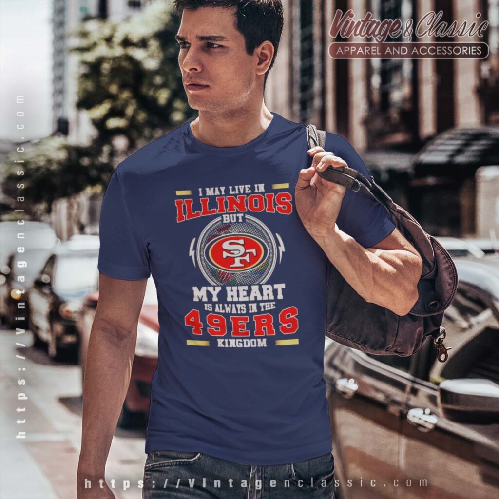 The “I May Live in Illinois But My Heart Is Always in the 49ers Kingdom” shirt is a playful declaration of loyalty and pride for San Francisco 49ers fans. It highlights the deep connection many fans have with their beloved team, even if they live far from the Bay Area. The shirt is a reminder that football is more than just a game; it’s a shared passion that unites people from all walks of life.