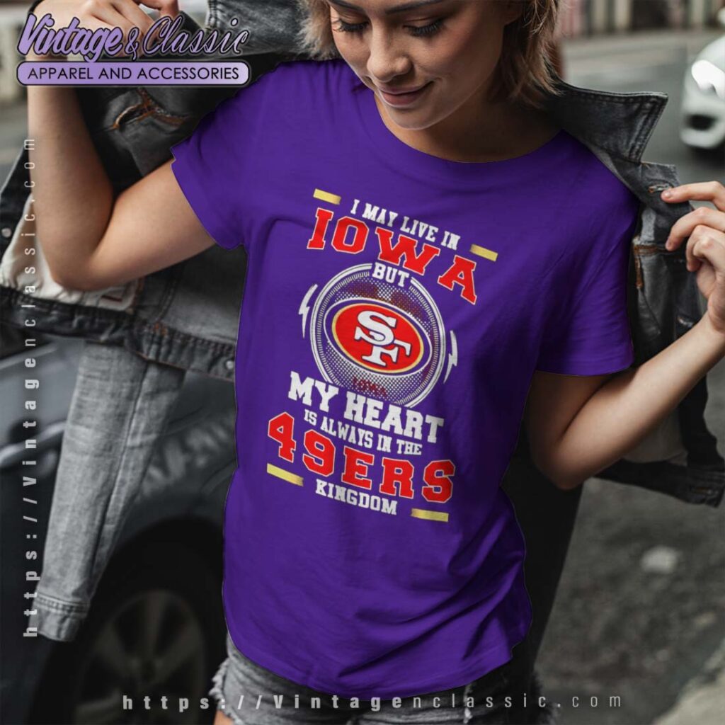 The “I May Live in Iowa But My Heart Is Always in the 49ers Kingdom” shirt is a playful declaration of loyalty and pride for San Francisco 49ers fans. It highlights the deep connection many fans have with their team, even if they live far from the Bay Area. The shirt is a reminder that football is more than just a game; it’s a shared passion that unites people from all walks of life.