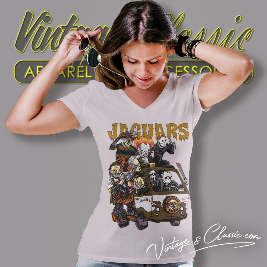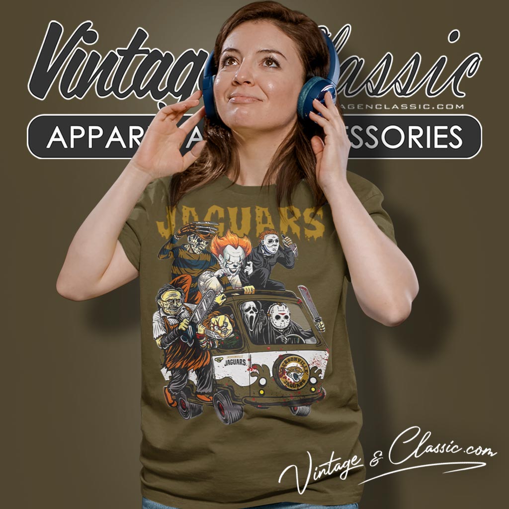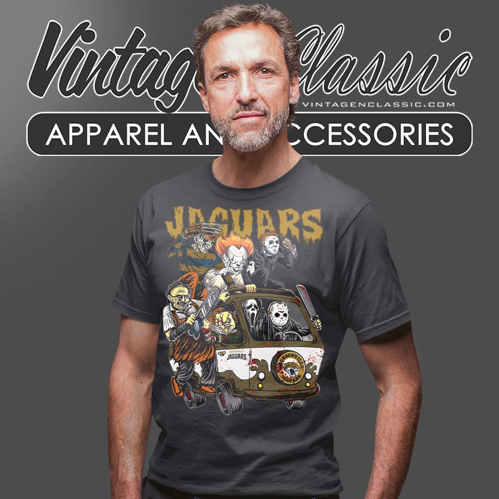 related keywords: Jacksonville Jaguars horror characters Halloween shirt, Jaguars Pennywise Freddy Jason tee, horror villains Jacksonville Jaguars fan shirt, Halloween Jaguars slasher van design