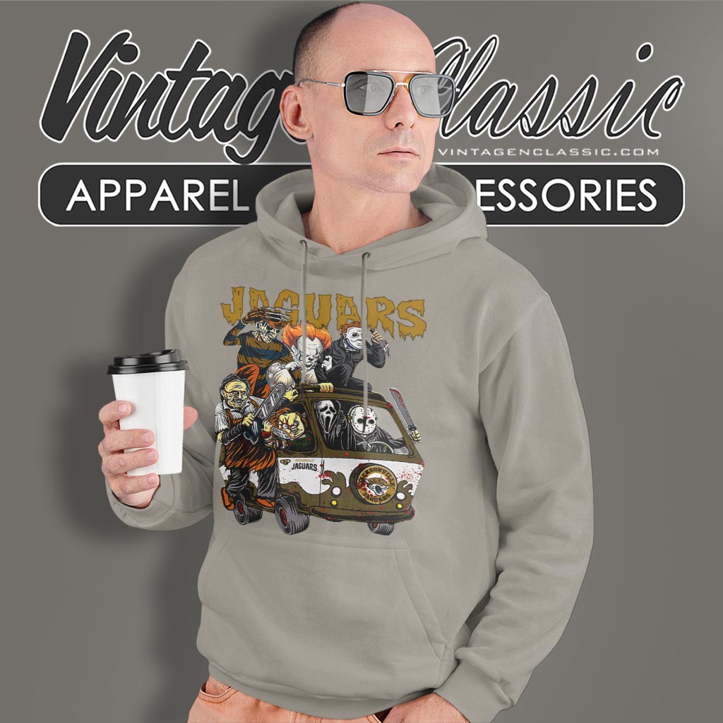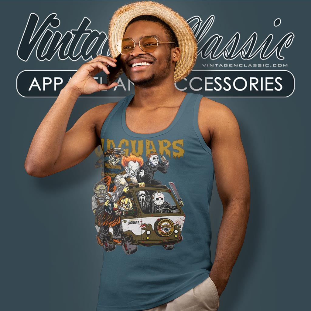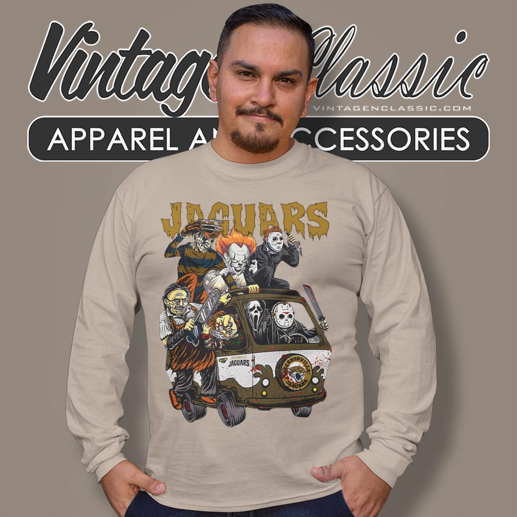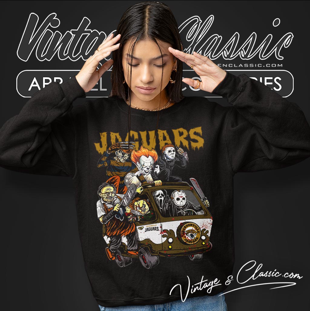 related keywords: Jacksonville Jaguars horror characters Halloween shirt, Jaguars Pennywise Freddy Jason tee, horror villains Jacksonville Jaguars fan shirt, Halloween Jaguars slasher van design