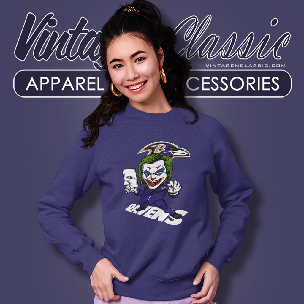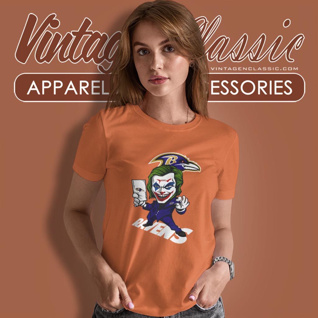 Related keywords: Joker-inspired Ravens apparel; Baltimore Ravens fan gear; quirky Ravens tee; Joker and Ravens design shirt.