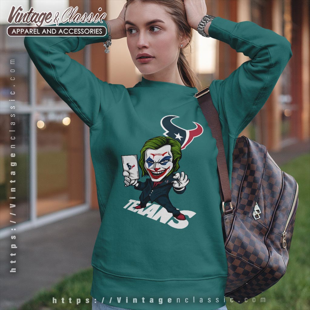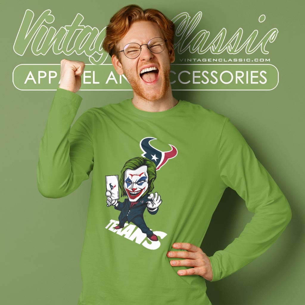 Related keywords: Joker-themed sports apparel; Houston Texans fan gear; unique NFL shirts; comic-inspired team shirts