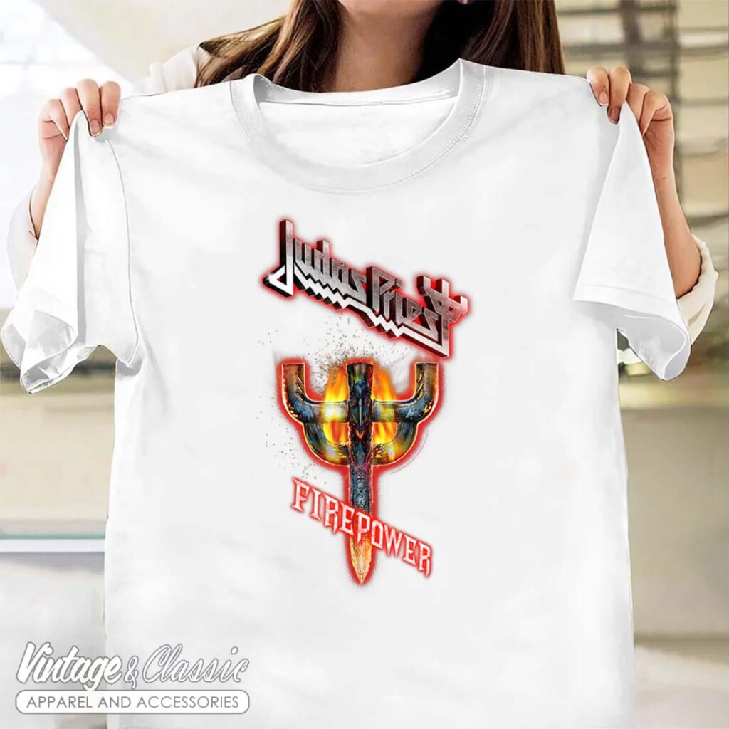 The Judas Priest Firepower Emblem shirt is a tribute to the legendary heavy metal band Judas Priest. This iconic design features a striking image of the band’s iconic logo, “Firepower,” prominently displayed. The shirt is a must-have for any die-hard Priest fan, offering a stylish and nostalgic way to show off their passion for the band.