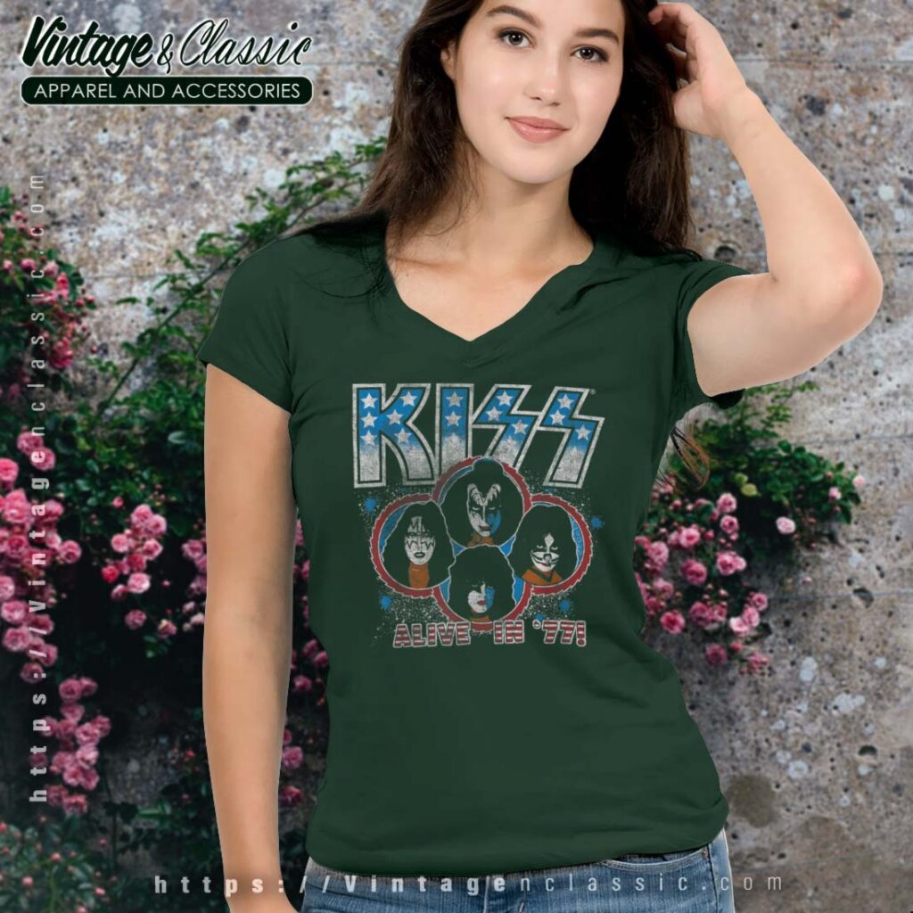 The shirt features a vibrant image of the band members, showcasing their signature makeup and costumes. The “Alive! In ’77” text is a nod to the tour’s name, making it a nostalgic and collectible item for fans.