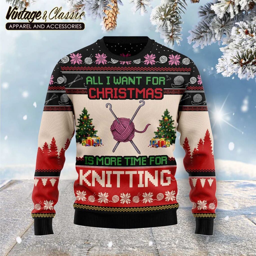 This is a fun and festive sweater for any knitting enthusiast! The “Knitting Lover Ugly Sweater” is a playful and unique piece that celebrates the joy of knitting. The “All I Want For Christmas Is More Time For Knitting” element adds a personal touch, making it a perfect gift for someone who loves to create with needles and yarn.