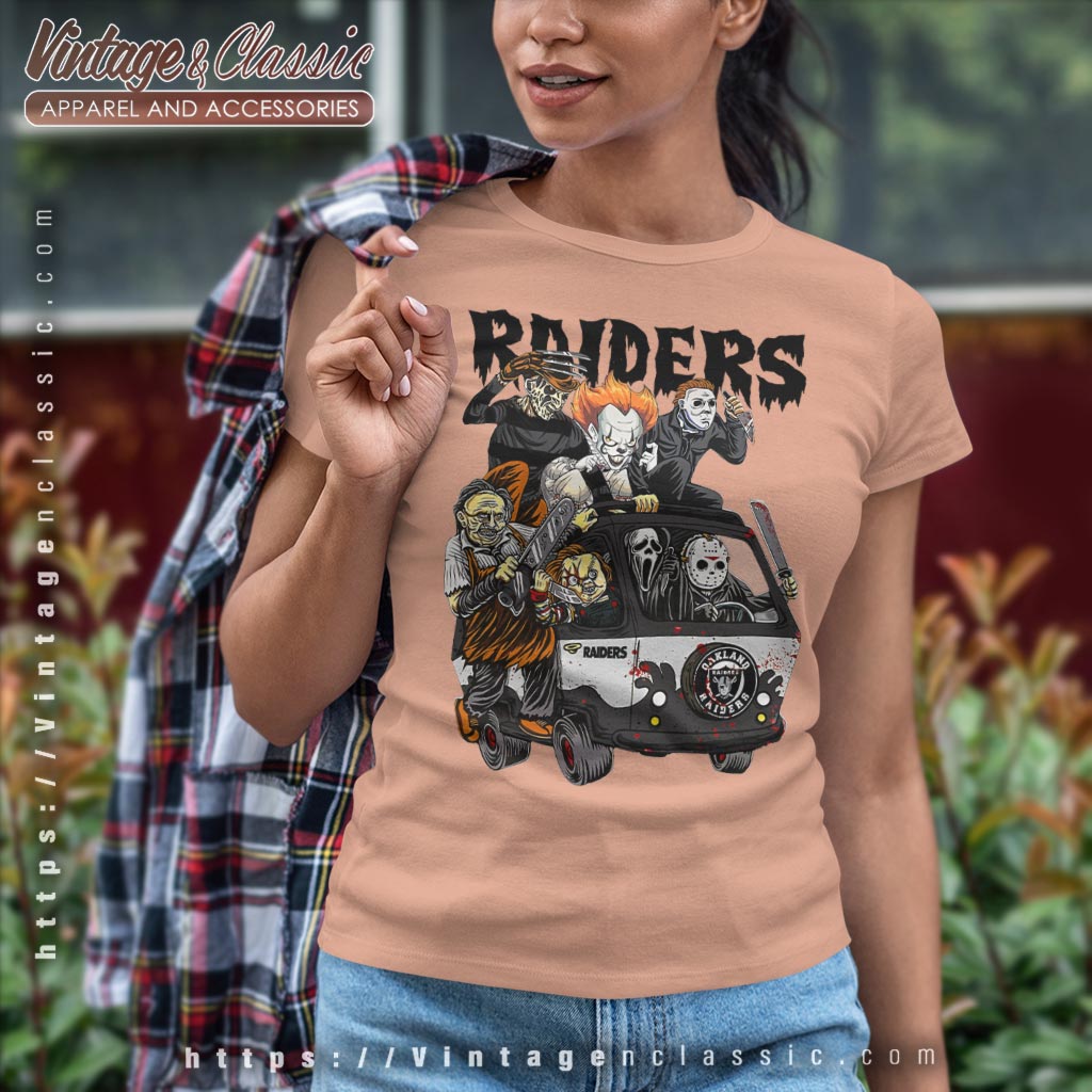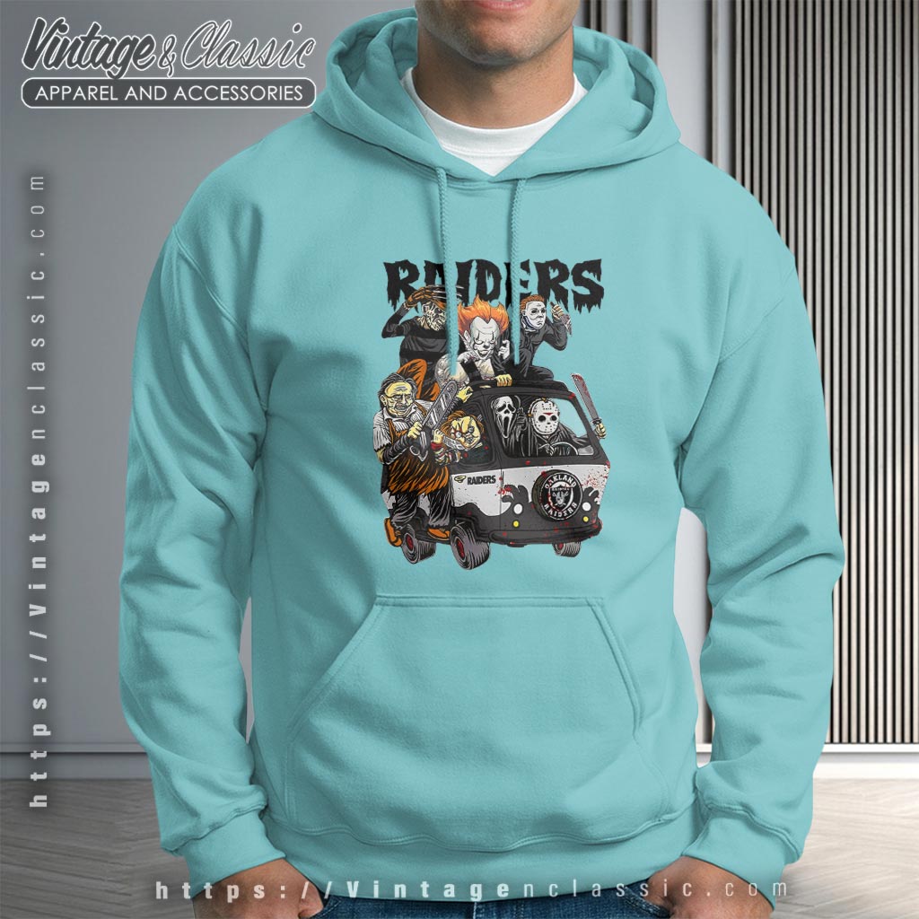 related keywords: Las Vegas Raiders horror characters Halloween shirt, Raiders Pennywise Freddy Jason tee, horror villains Las Vegas Raiders fan shirt, Halloween Raiders slasher van design