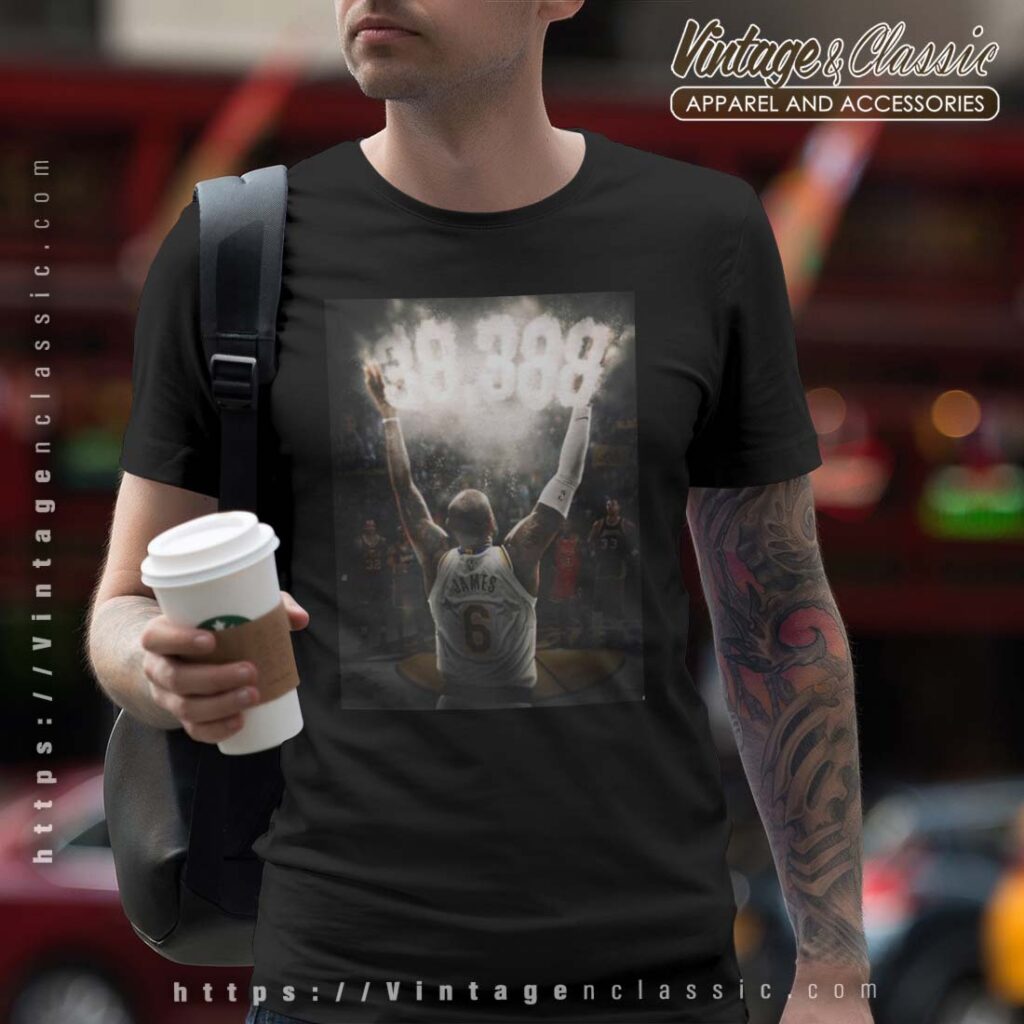 This shirt features a stunning graphic of Lebron James, arms raised triumphantly, with the iconic scoring number “38,388” illuminated above him. The artwork encapsulates the energy and excitement of the moment, with Lebron’s silhouette standing tall against a backdrop of cheering fans and fellow players. The design brilliantly captures the emotion and triumph of reaching such a remarkable career milestone, making it a piece of history you can wear.