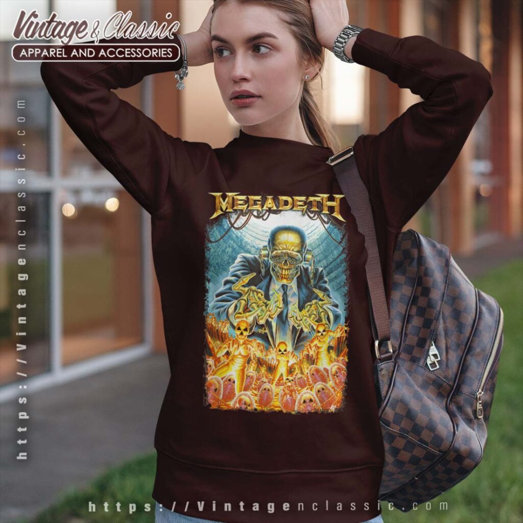 This is a vintage Megadeth shirt featuring the iconic “Megadeth” logo and the phrase “Nuke Kids Vic.” The design is a nod to the band’s legendary status and their outspoken anti-war stance. This shirt is a must-have for any Megadeth fan, especially those who appreciate the band’s rebellious spirit and their powerful lyrics.