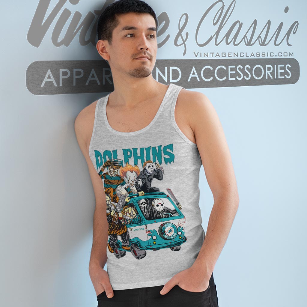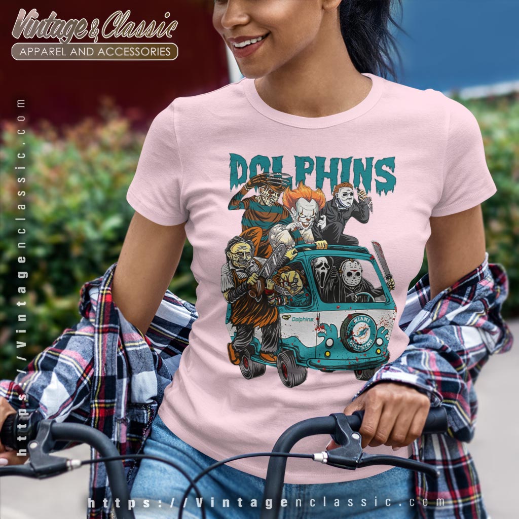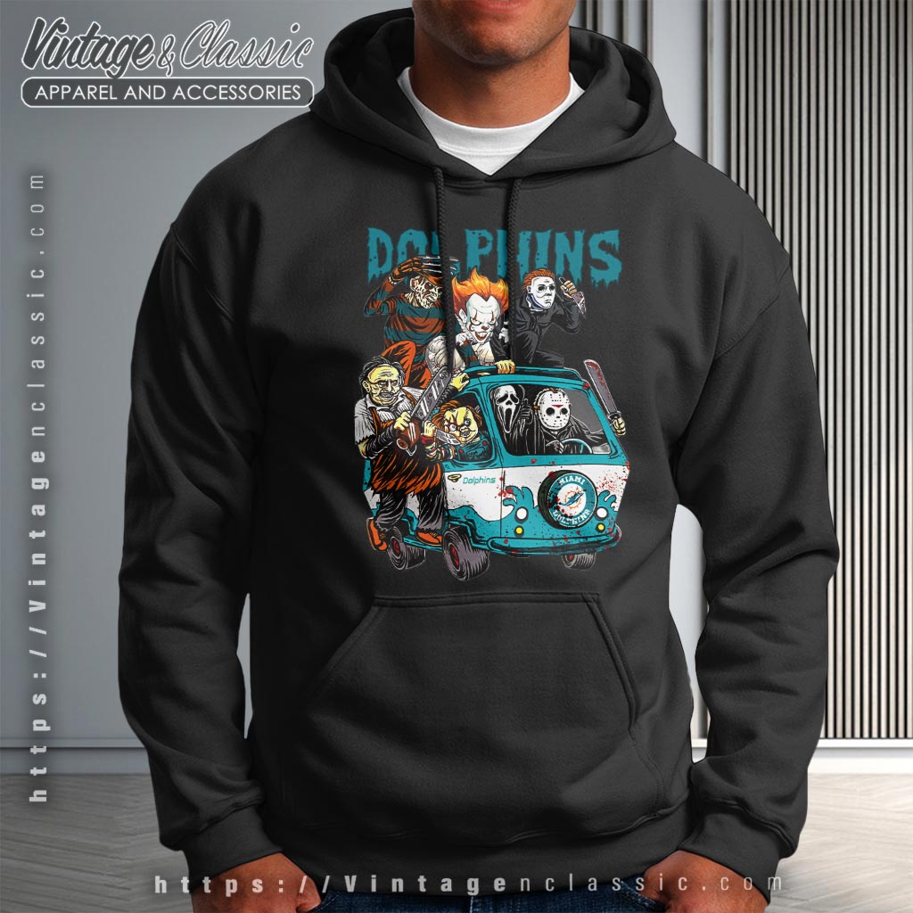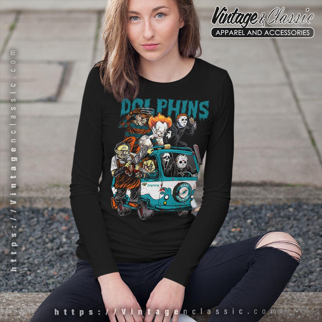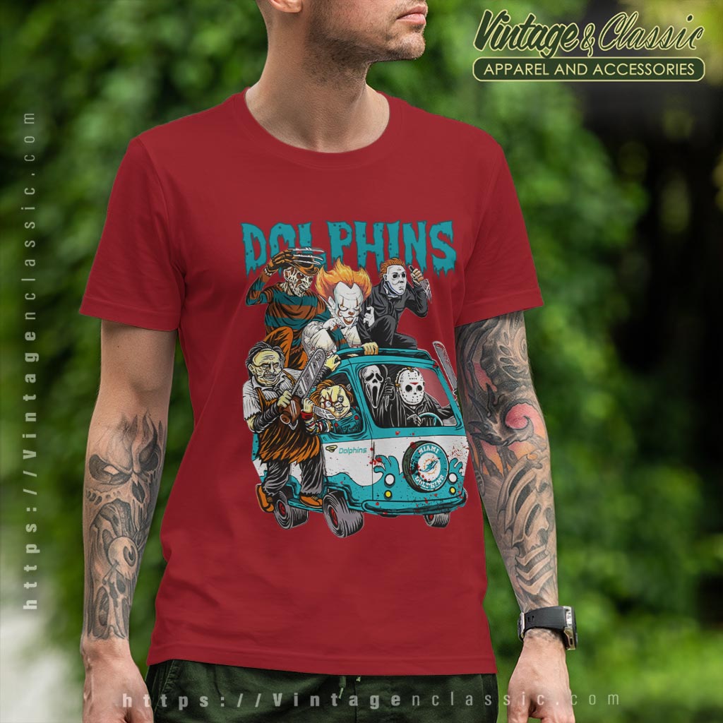 related keywords: Miami Dolphins horror characters Halloween shirt, Dolphins Pennywise Freddy Jason tee, horror villains Miami Dolphins fan shirt, Halloween Dolphins slasher van design