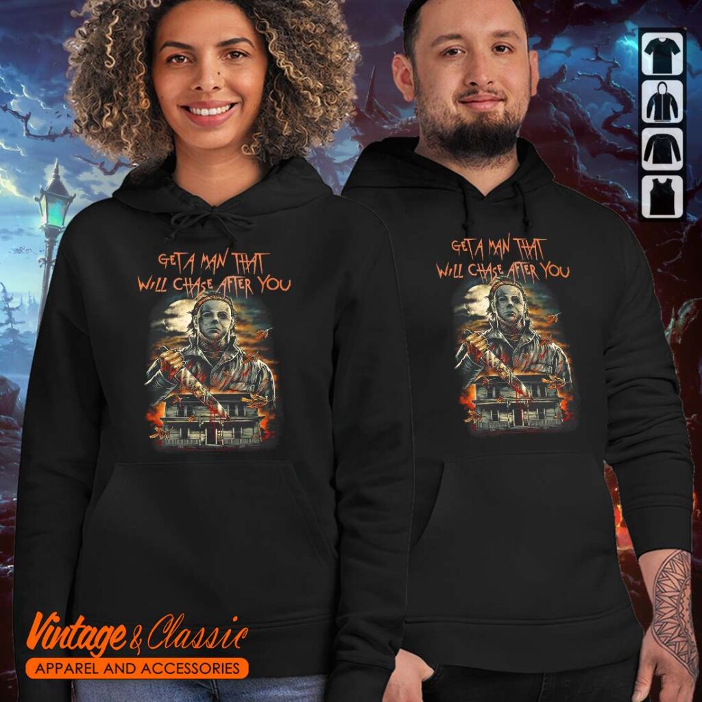 This vintage Halloween Michael Myers shirt is a playful and iconic piece for any horror fan. The design features a humorous take on the iconic slasher villain, Michael Myers, with the iconic phrase “Get a man that will chase after you.” This shirt is sure to be a conversation starter and a fun way to show off your love for the Halloween franchise.