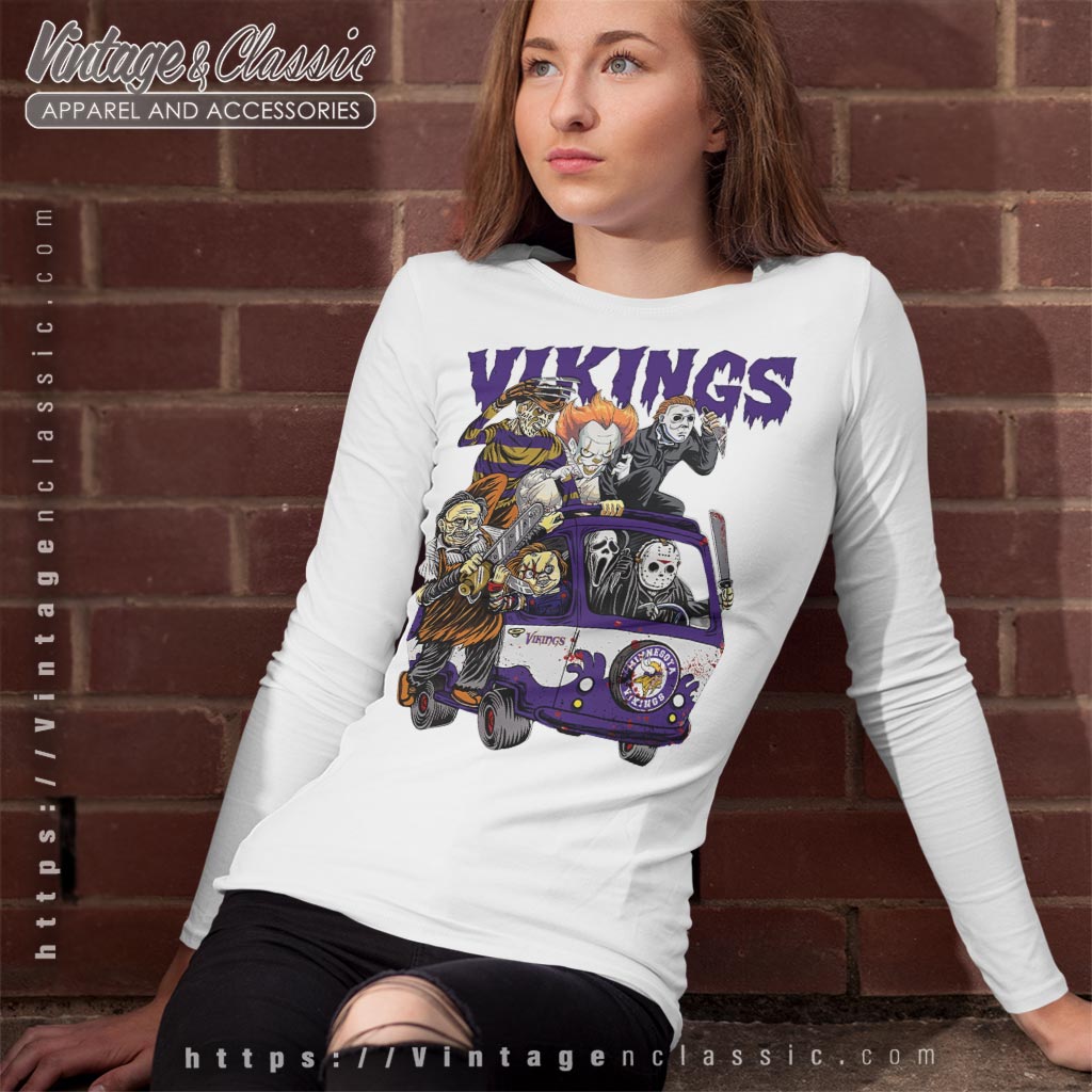related keywords: Minnesota Vikings horror characters Halloween shirt, Vikings Pennywise Freddy Jason tee, horror villains Minnesota Vikings fan shirt, Halloween Vikings slasher van design