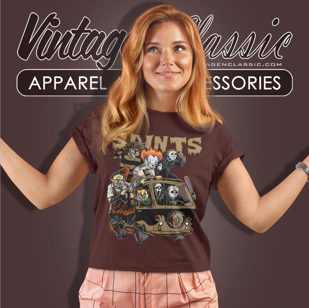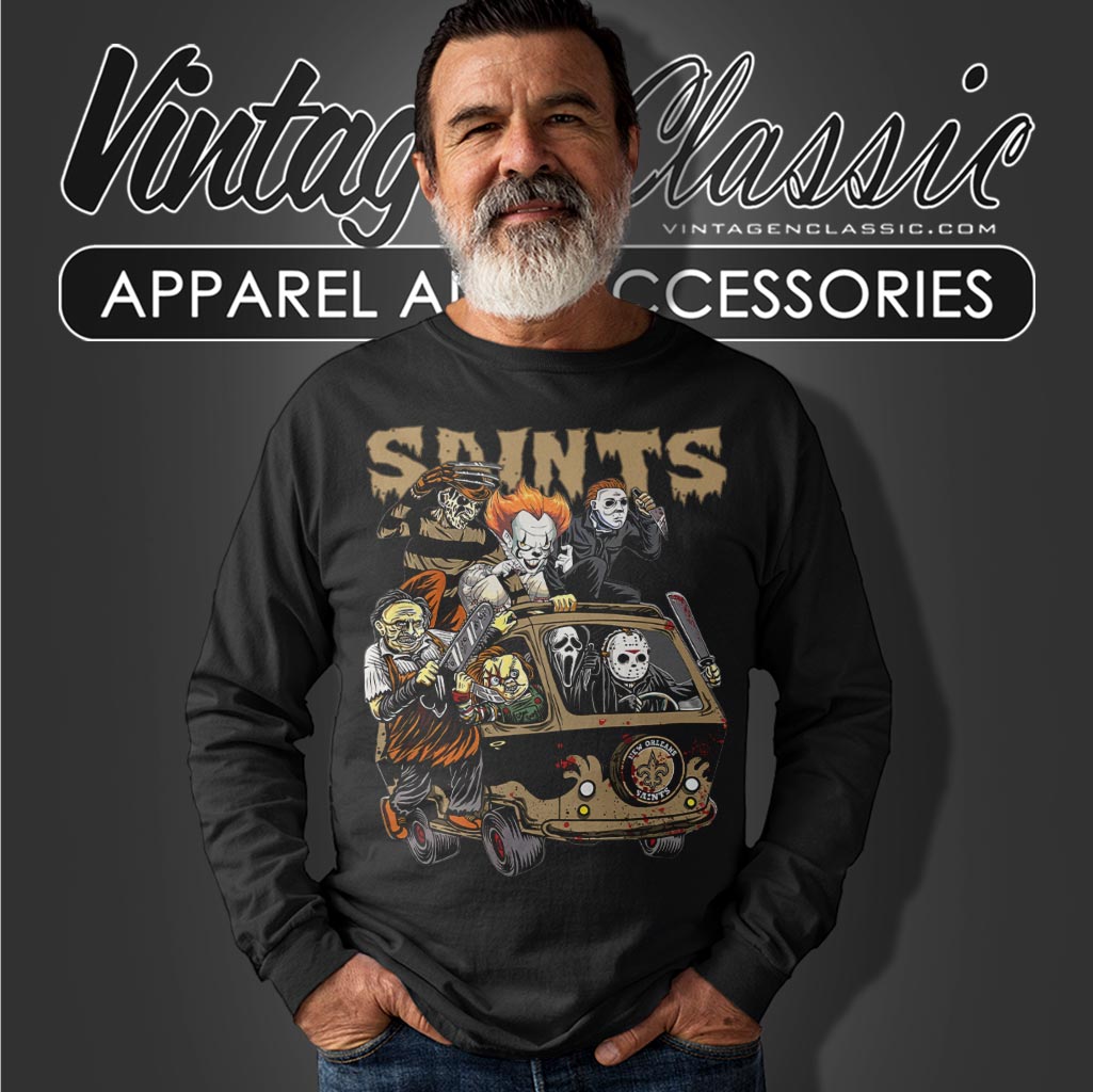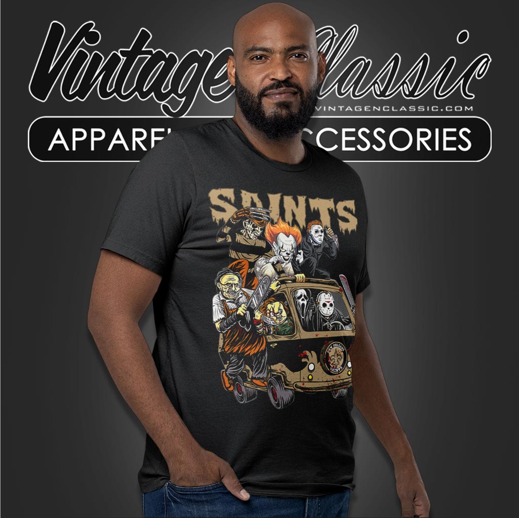 related keywords: New Orleans Saints horror characters Halloween shirt, Saints Pennywise Freddy Jason tee, horror villains New Orleans Saints fan shirt, Halloween Saints slasher van design