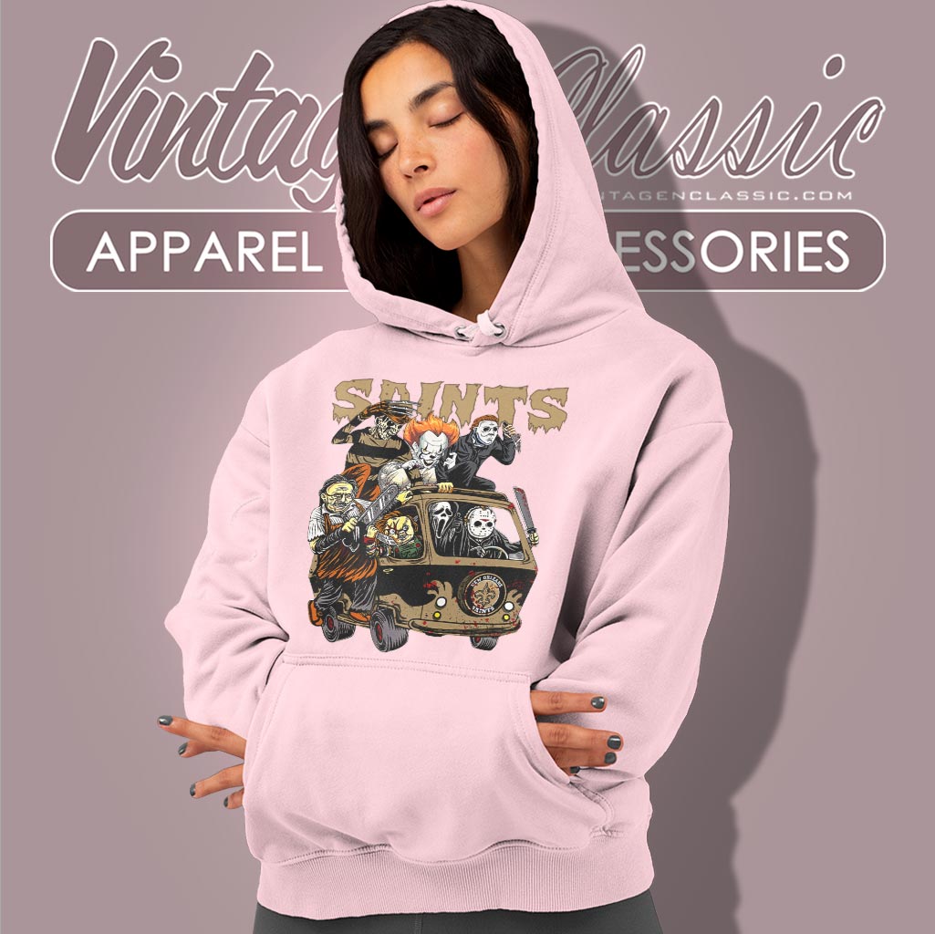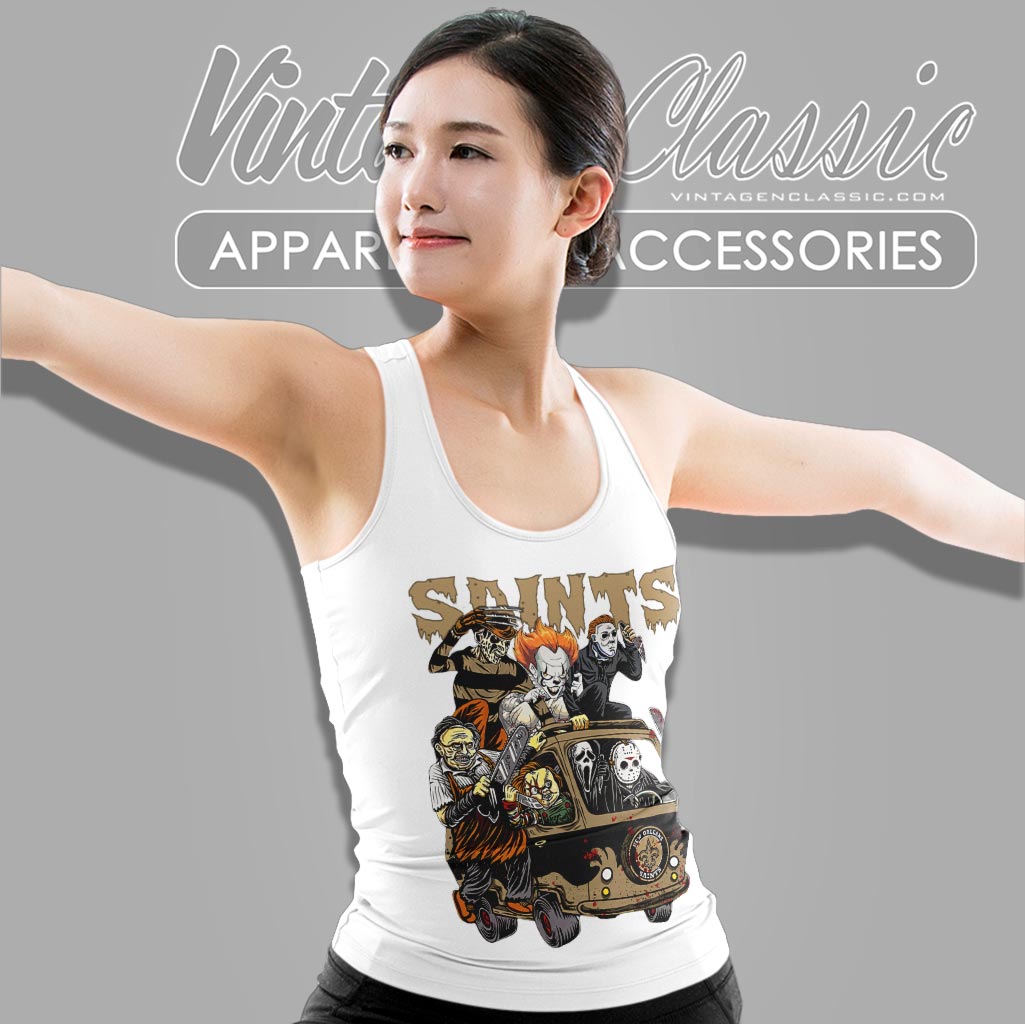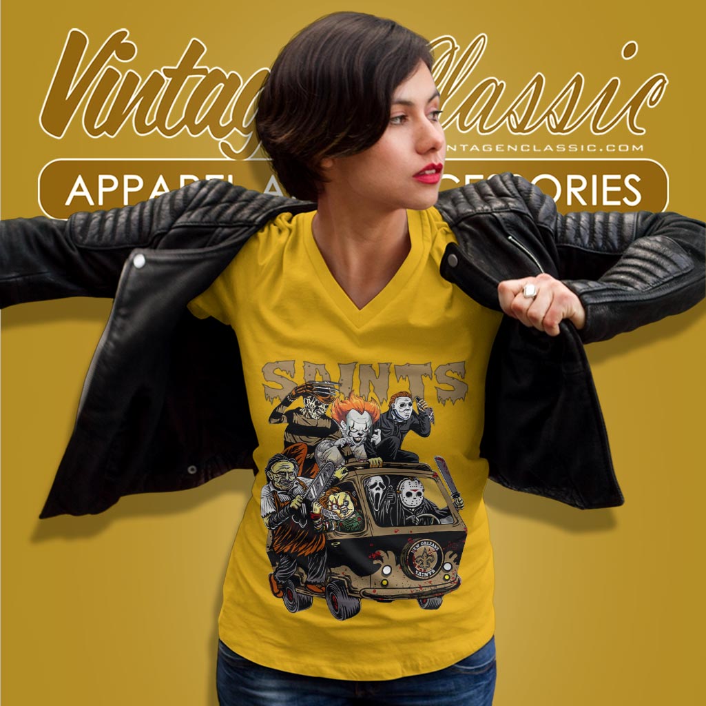 related keywords: New Orleans Saints horror characters Halloween shirt, Saints Pennywise Freddy Jason tee, horror villains New Orleans Saints fan shirt, Halloween Saints slasher van design
