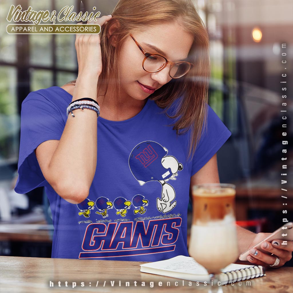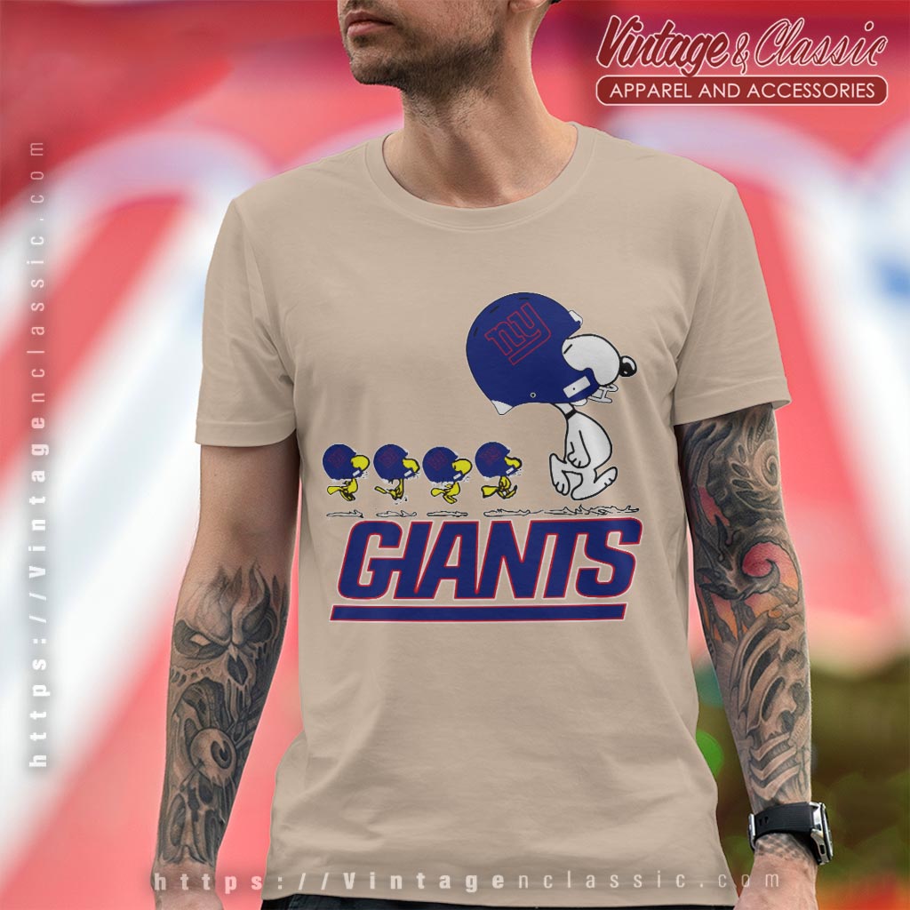Related keywords: New York Giants team apparel; Snoopy sports tee; Woodstock fan shirt; Giants Peanuts collaboration.